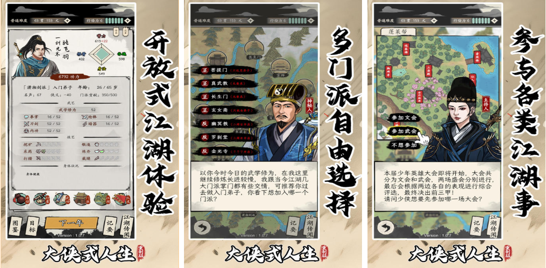 融合人生模拟与武侠成长双主线的创新作品,时间轴覆盖少年习武、青年闯荡、中年隐退至晚年授徒全过程。地图采用分区域加载机制,囊括江南水乡、塞北荒原、西域古城等十余处地貌,各具气候特征与交互要素。门派系统开放少林、武当、峨眉、丐帮等八大宗门,每派提供逾三十种可研习武学,技能组合无固定套路限制,支持自定义连招逻辑。支线任务总量达200+条,关键抉择影响声望、姻缘与结局分支。