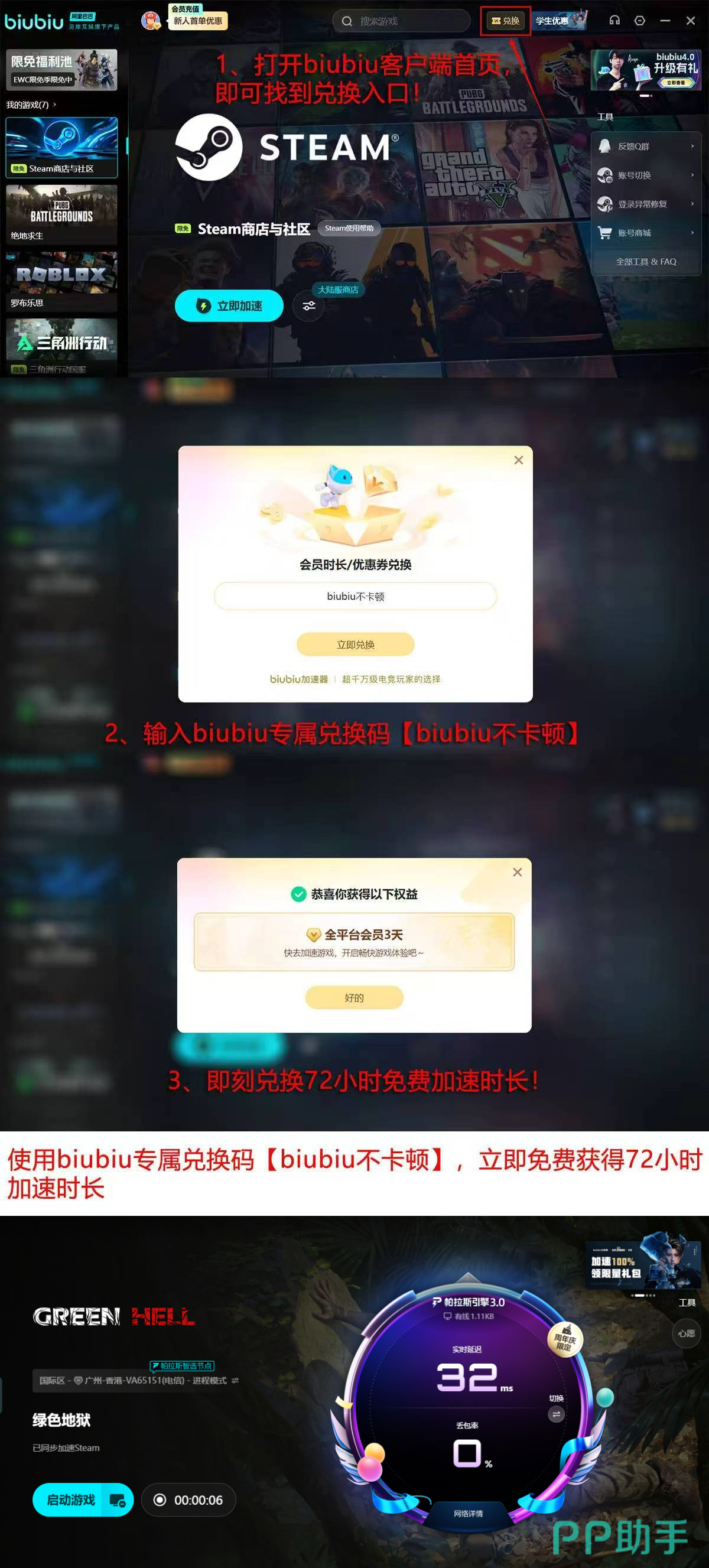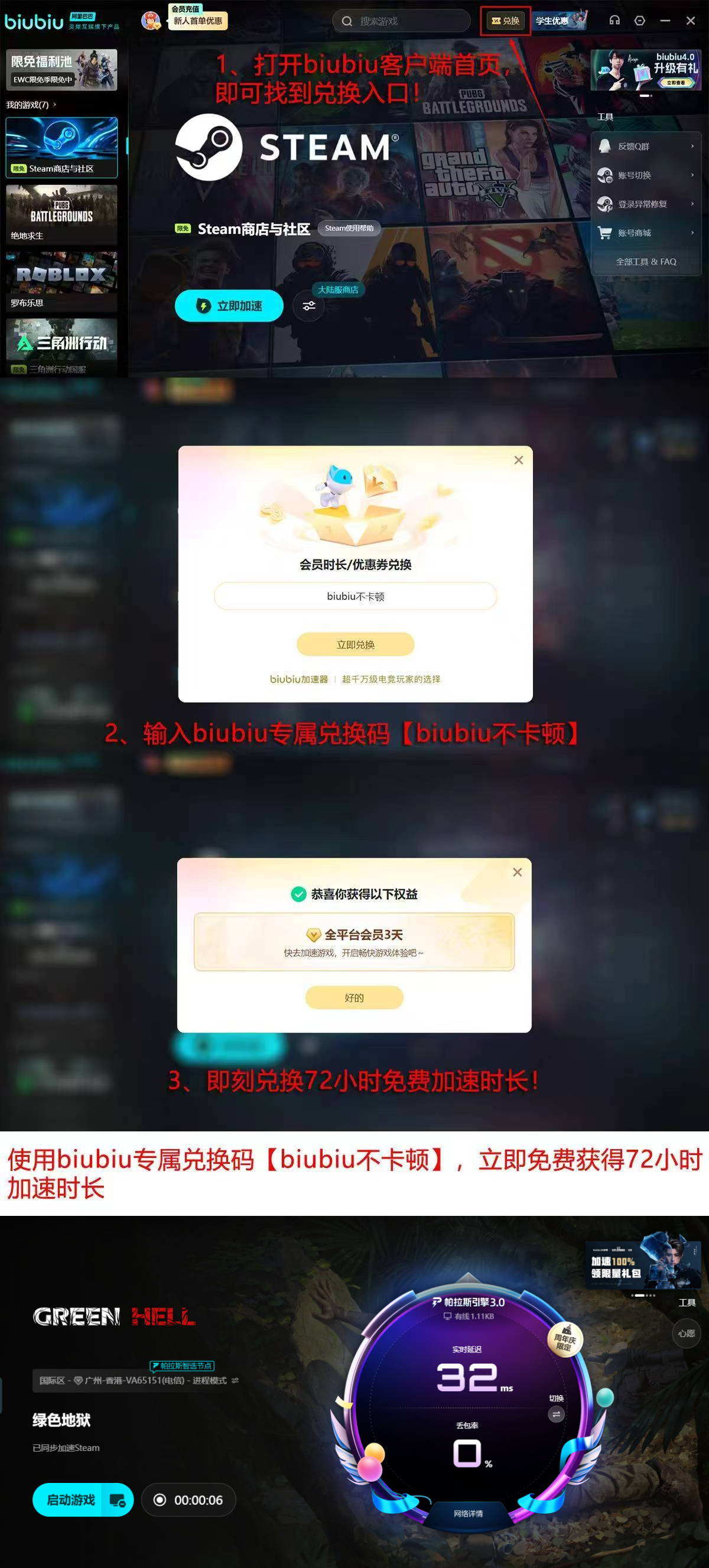 即刻启用,新用户注册后即可享首日24小时全功能免费试用权益;输入激活码【biubiu不卡顿】,可额外延长稳定加速时长至72小时;叠加使用,新人总计可获得连续96小时的高性能加速服务,从容应对《绿色地狱》中复杂地形、动态天气与多人协作带来的全维度网络挑战。