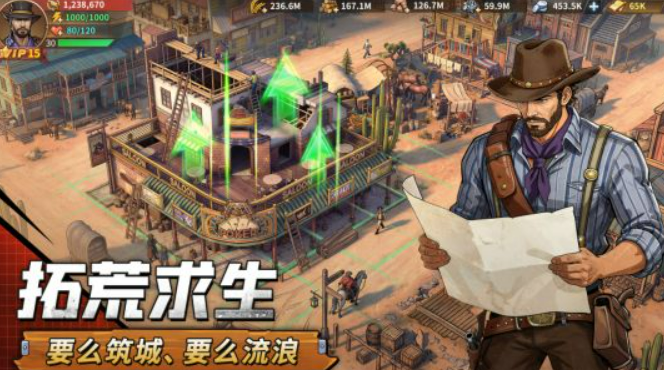视觉呈现方面,《落日战火》采用高辨识度的复古废土美学:泛黄沙砾、锈蚀铁轨、残破驿站与轰鸣蒸汽火车共同勾勒出苍凉而厚重的西部图景。玩法设计以“小镇经营+实时对抗”双核驱动,前期聚焦基建布局——行政厅统筹全局,木材厂与铁矿厂保障基础资源供给,建筑选址直接影响采集效率;系统内置一键升级机制,大幅降低重复操作负担,使玩家能更专注中后期战略部署与战力调配。