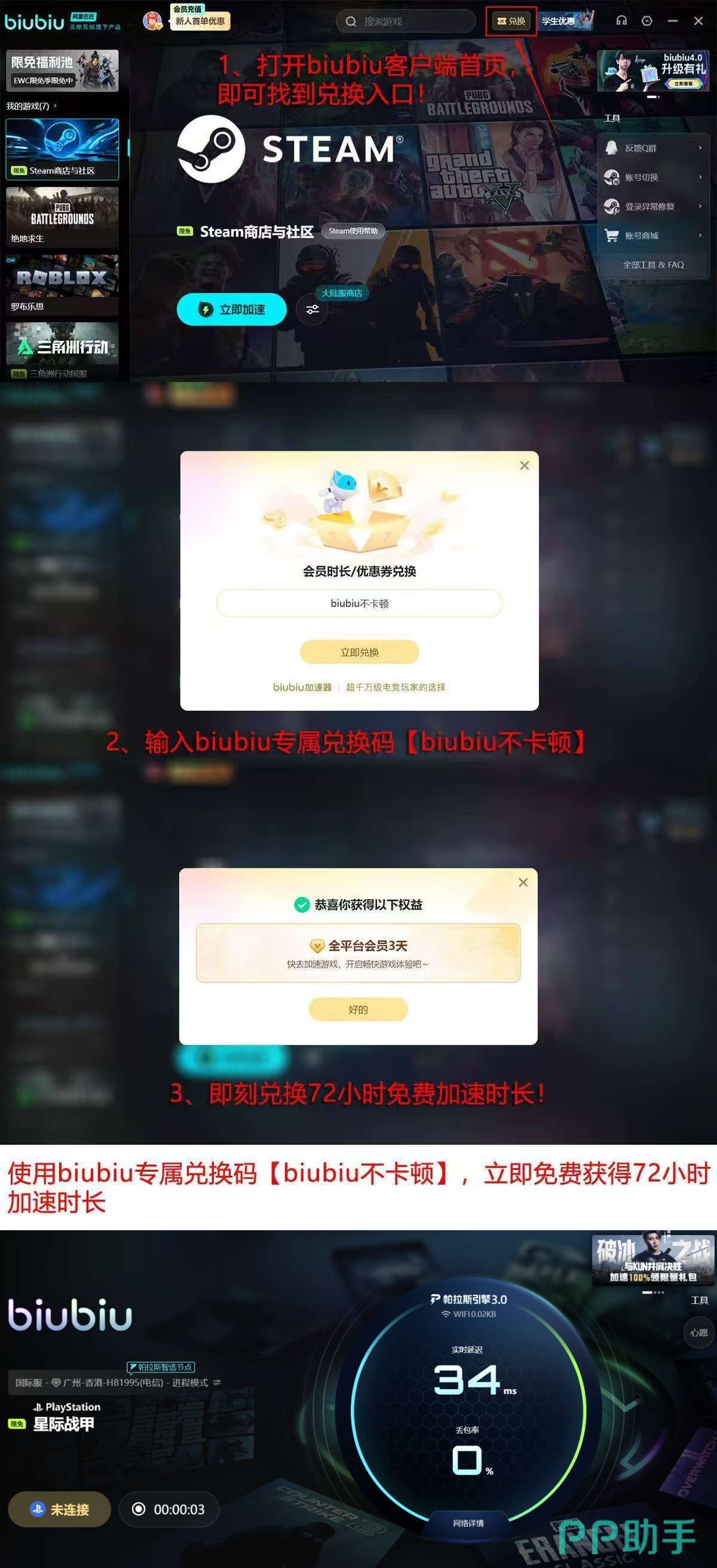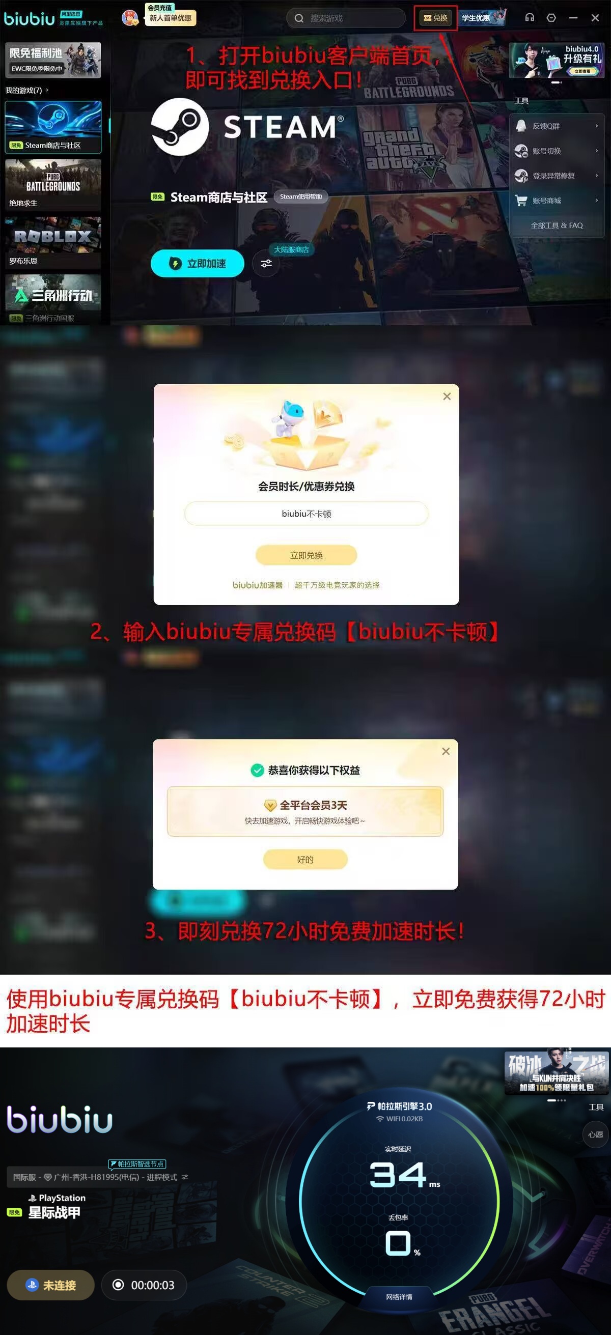 新用户完成首次注册并登录后,系统将自动发放24小时全功能加速时长。进入主界面兑换中心,输入专属口令【biubiu不卡顿】,即可额外获赠3天跨平台加速权益。两项叠加总计96小时,覆盖PC、安卓及iOS全端口,支持包括《Warframe》在内的全部兼容游戏。用户可将常用游戏加入“我的游戏”列表,后续一键启动即自动启用优化通道;后台实时显示当前延迟值、丢包率、路由跳转节点等关键指标,便于精准掌握网络状态。