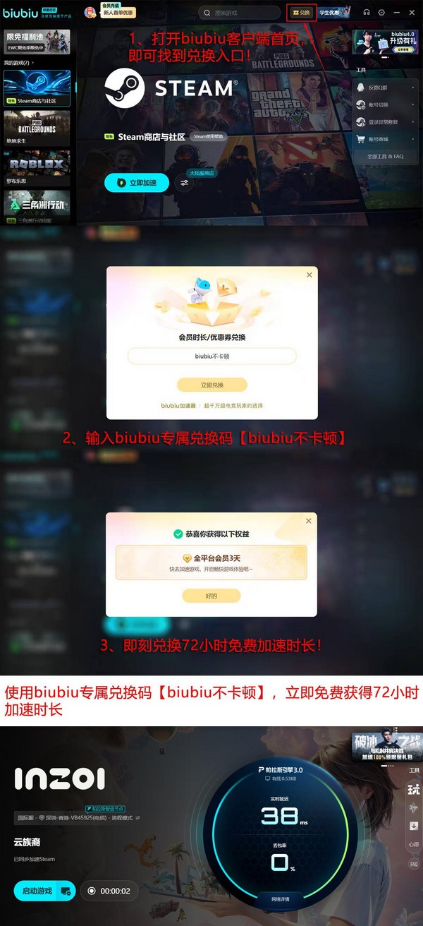 若对产品效果存疑,可先通过免费方式验证。新用户完成注册后,系统将自动发放24小时全功能试用权限。此外,进入兑换窗口输入“biubiu不卡顿”(注意区分大小写,仅限单次使用),即可额外领取72小时加速时长。该兑换码面向所有用户开放,新老账号均可使用。建议优先消耗初始24小时,再激活兑换时长,总计可获得96小时无限制体验周期。