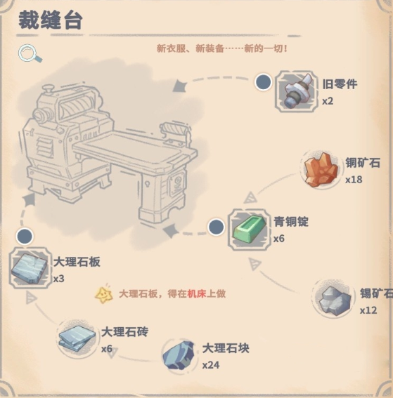 驼牛站的制造并不算难,具体来说是驼牛站本身制造不难,但我们在制造它之前,首先需要制造出“裁缝台”后才能建出。“裁缝台”的材料需要2个旧零件,6个青铜锭和遗迹大理石板3个。前两个零件不算太难,基本上跑跑图就能获得,而遗迹大理石板可以说是难住了很多小伙伴们。小编这里推荐小伙伴们可以没事多去探索探索遗迹,比如“回收公司遗迹”等等这些地方,基本上打上几个怪,跑一跑遗迹之后,都能获得几个遗迹大理石板。注意!遗迹的怪物都比较强力,小伙伴们一定要做好准备再去!
