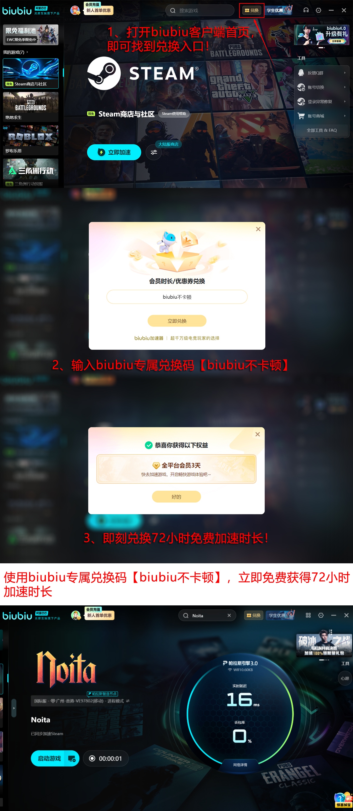 即刻启用biubiu加速器,还可享受专属新手权益:注册即赠24小时全功能免费加速时长;输入兑换码【biubiu不卡顿】,额外获得72小时高级权限体验期。无隐藏条件,无强制续费,叠加使用总计可达96小时,充分满足多周目挑战与深度玩法测试所需。
