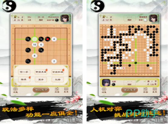 本作采用水墨写意风格界面,还原传统棋室氛围。支持实时好友联机对战、离线人机对弈两种核心模式,内置多档难度AI,覆盖入门到业余高段水平。操作响应灵敏,支持悔棋、复盘、打谱等功能,界面布局清晰,适配各类安卓设备屏幕尺寸。
