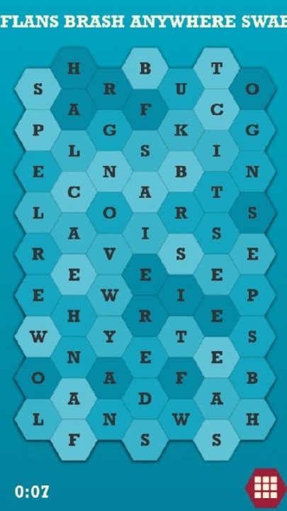 一个休闲益智单词拼写游戏,也是通过滑动连接表格中的字母组成有效单词,连线可以横竖斜,也可以转折,松手后系统会自动检测单词是否成立,成立的话所用字母会被清空,表格中所有字母清空即为通关。关卡会从简单的3、4个字母的词开始,随着关卡进度,不仅词会越来越长,而且还会加入锁定字母和倒计时等条件。
