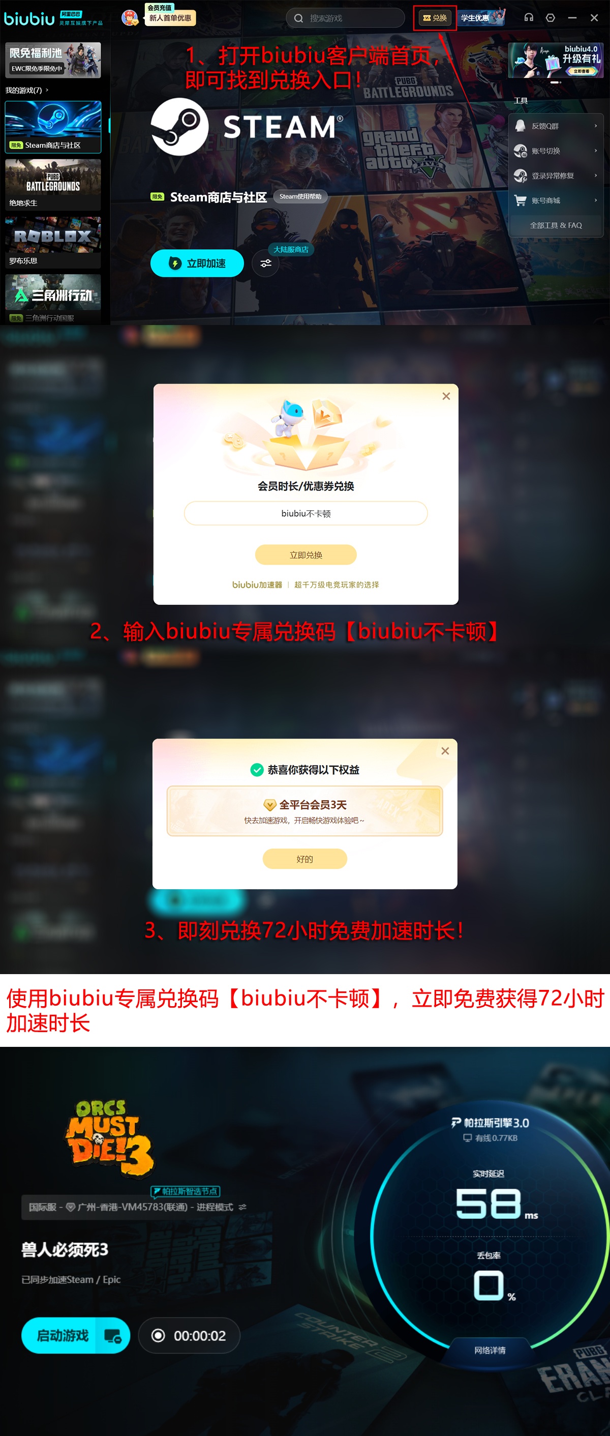 新用户注册即可获得24小时全平台通用免费试用资格,无设备绑定限制。所有账号用户输入专属兑换码【biubiu不卡顿】,还可额外激活72小时高级优化服务时长,期间涵盖《兽人必须死3》在内的全部游戏均可一键启用低延迟通道,实现实时帧率稳定、加载响应迅速、联机同步精准的高品质网络体验。