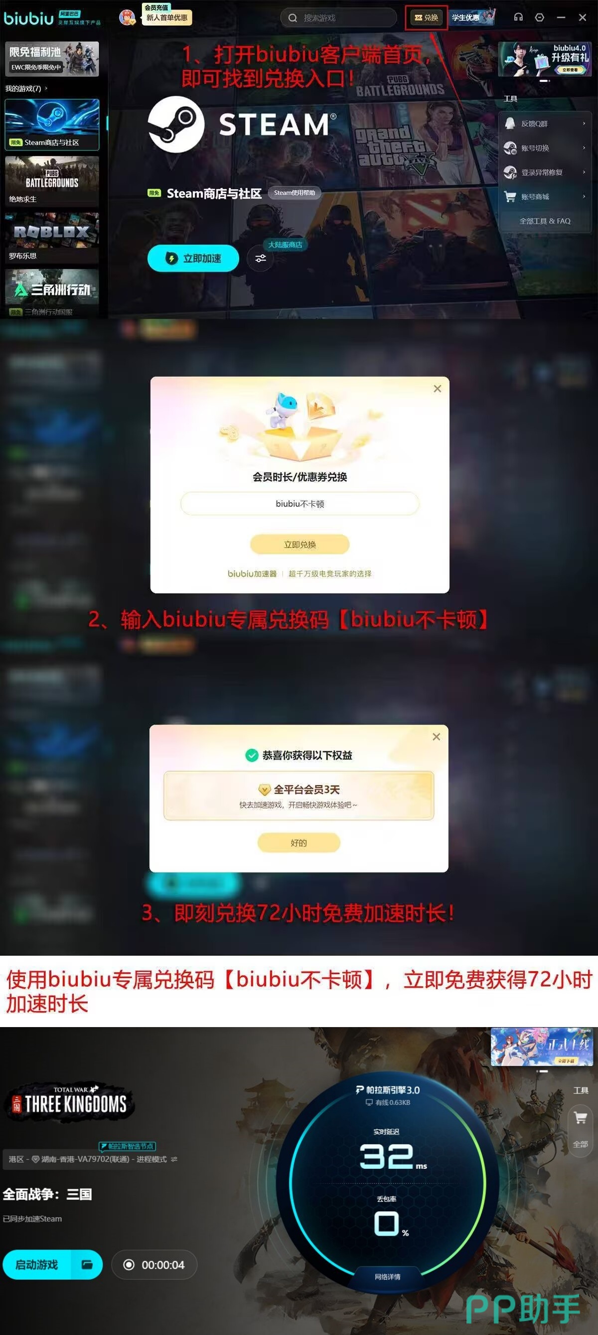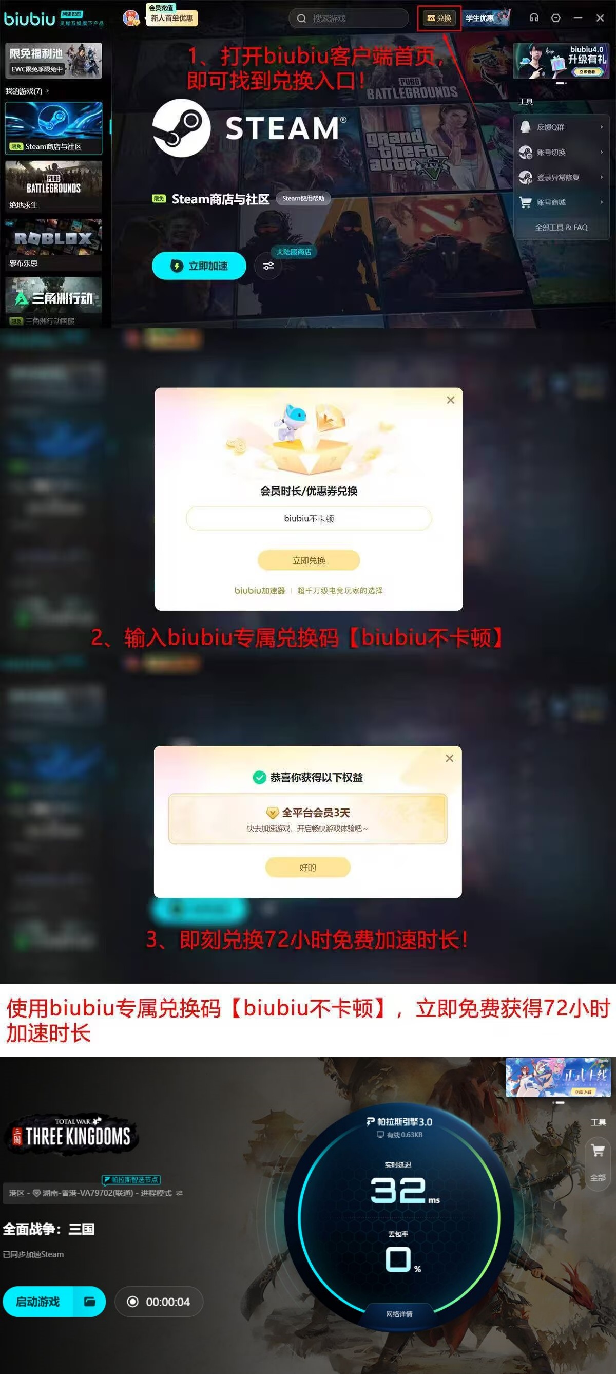 在服务权益方面,新注册用户可直接获得24小时全功能加速时长,零门槛体验优化效果。所有账号用户均可通过活动入口【biubiu不卡顿】领取为期三天的平台全量功能试用权限,覆盖《全面战争:三国》及其他主流策略、竞技类游戏,无需额外付费或绑定设备限制。