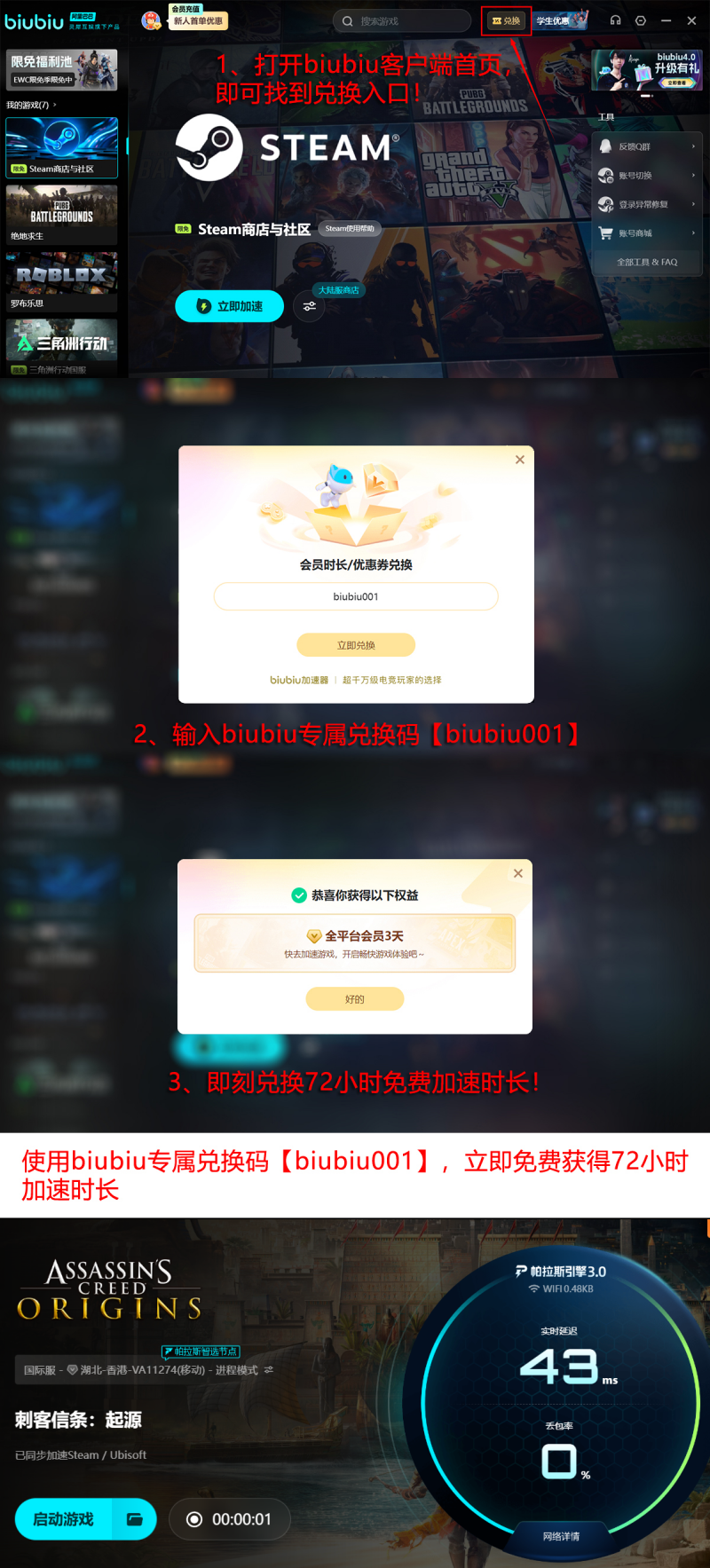 该加速器已获职业电竞领域权威背书——正式成为Pero战队官方指定网络加速解决方案,其稳定性与低延迟特性经高强度赛事环境持续验证。新用户注册后即可领取24小时全功能试用权限;叠加通用兑换码【biubiu001】,还可额外激活连续72小时加速服务;首期累计免费时长最高可达96小时,全程无需付费,切实降低体验门槛。