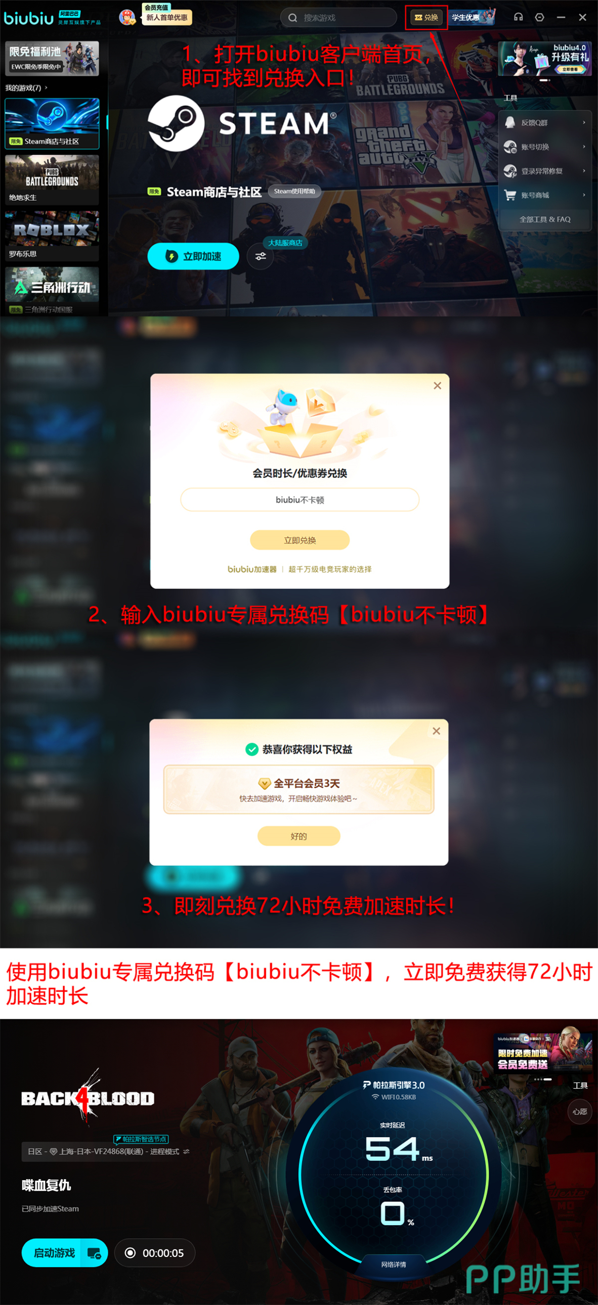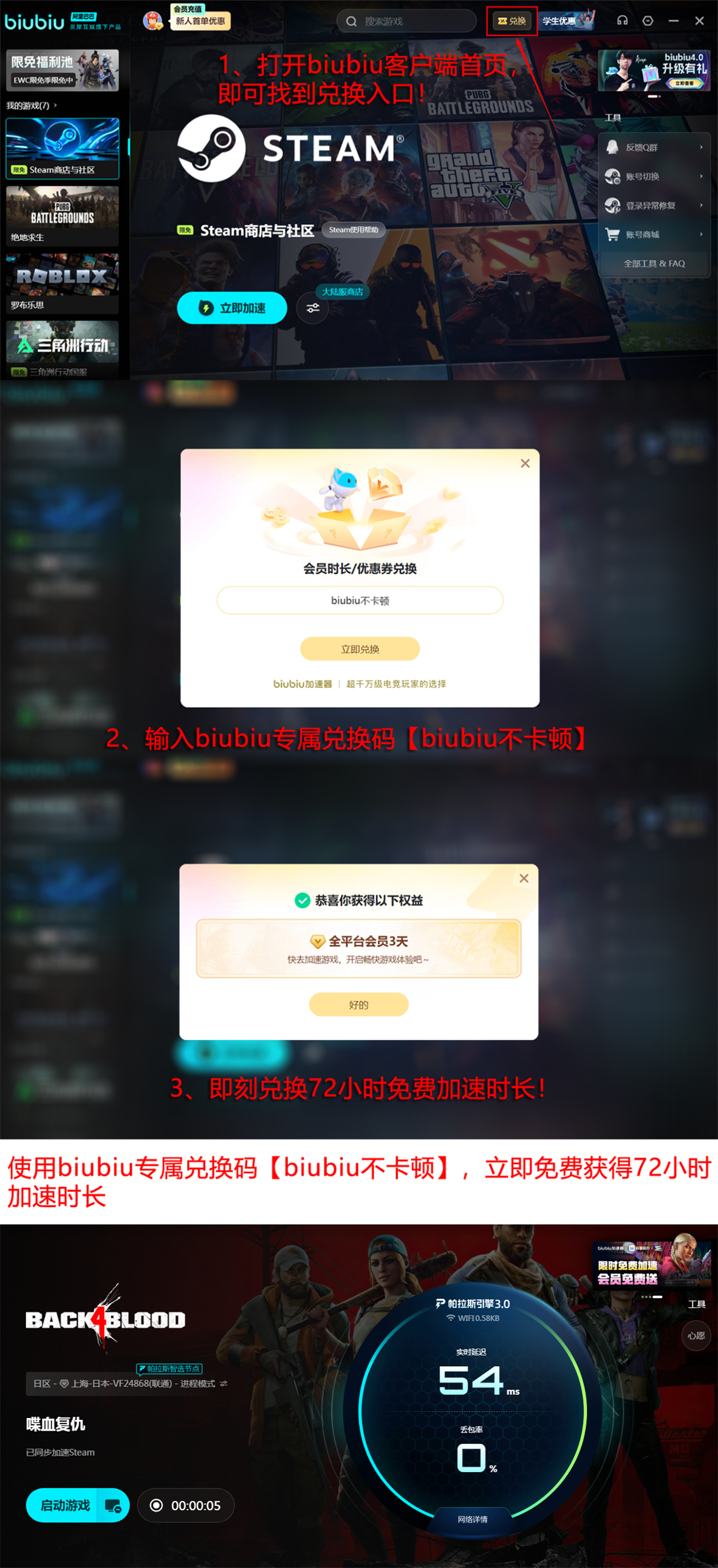 biubiu加速器同步提供高价值新人权益:新用户完成注册后即可享24小时全游戏免费加速时长;另附专属兑换码【biubiu不卡顿】,每个账号限用一次,可额外兑换72小时连续加速服务。两项福利叠加,总计96小时无门槛试用周期,足以为玩家提供充分时间评估其稳定性、加速效率及功能完备性。