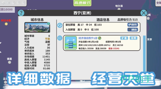 环球酒店筑传奇,昼夜流转显真实,玩家从一家无名小酒店做起,逐步发展成遍布全球的七星级酒店集团,游戏主界面是世界地图,玩家可以在全球各大城市挑选合适位置开设酒店,安排员工打理,还要应对不同城市的经济、气候和治安变化,按地区客人习惯调整服务,还能招募高管帮忙管理酒店日常,举办特色活动吸引不同等级的顾客,沉浸式体验全球化经营的乐趣。