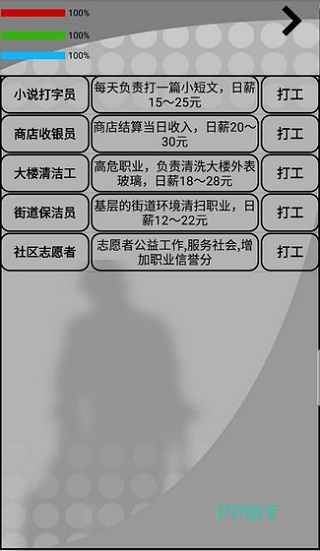 构建三维度健康管理系统:饥饿值影响体力恢复速度,健康值决定疾病发生概率,心理值关联工作效率与随机事件触发。玩家需平衡便利店夜班、工厂流水线、家教兼职等多类型工作,兼顾用餐、休息、社交活动以维持状态稳定。不同岗位单日收益差异显著,同时体力消耗系数各异,要求玩家制定可持续的劳作周期。