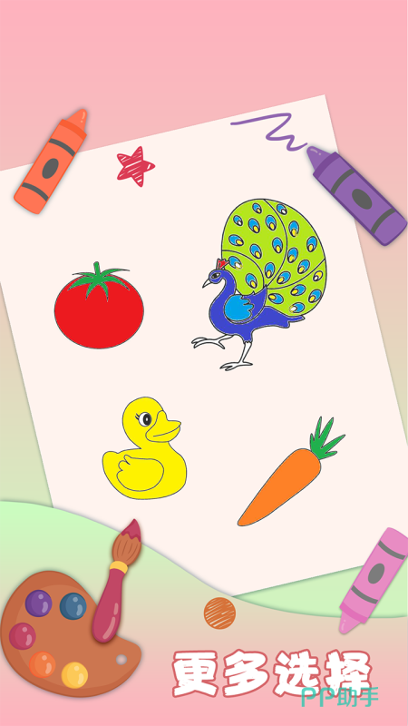 内置丰富主题画册,涵盖动物、植物、节日元素、生活场景等百余幅线稿。采用拟真笔触算法,支持压力感应与色彩混合效果,还原真实绘画体验。通过自由配色与构图尝试,潜移默化培养色彩感知力与艺术表现欲。