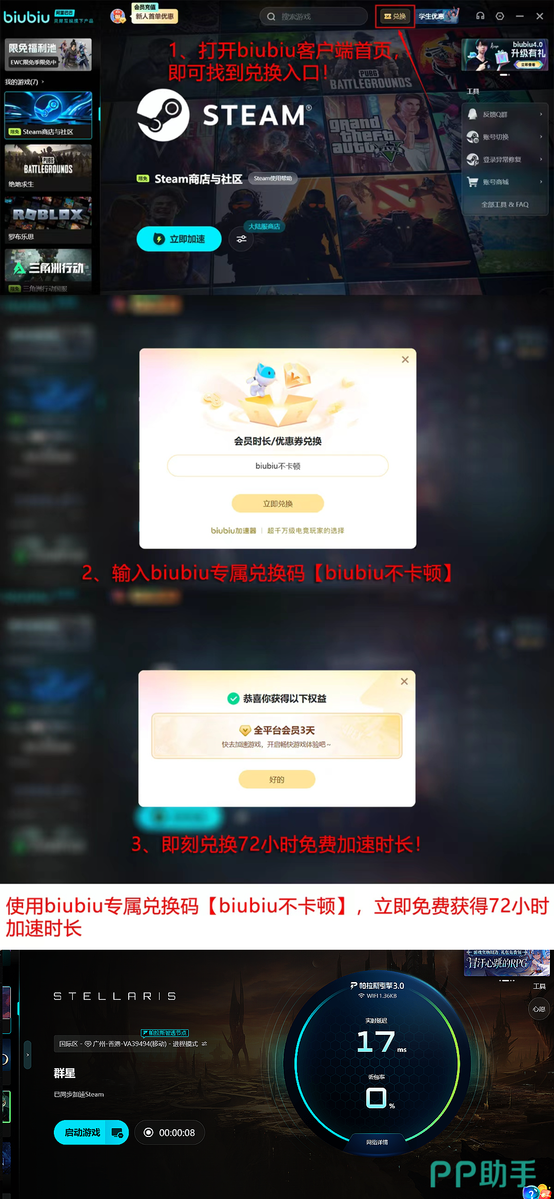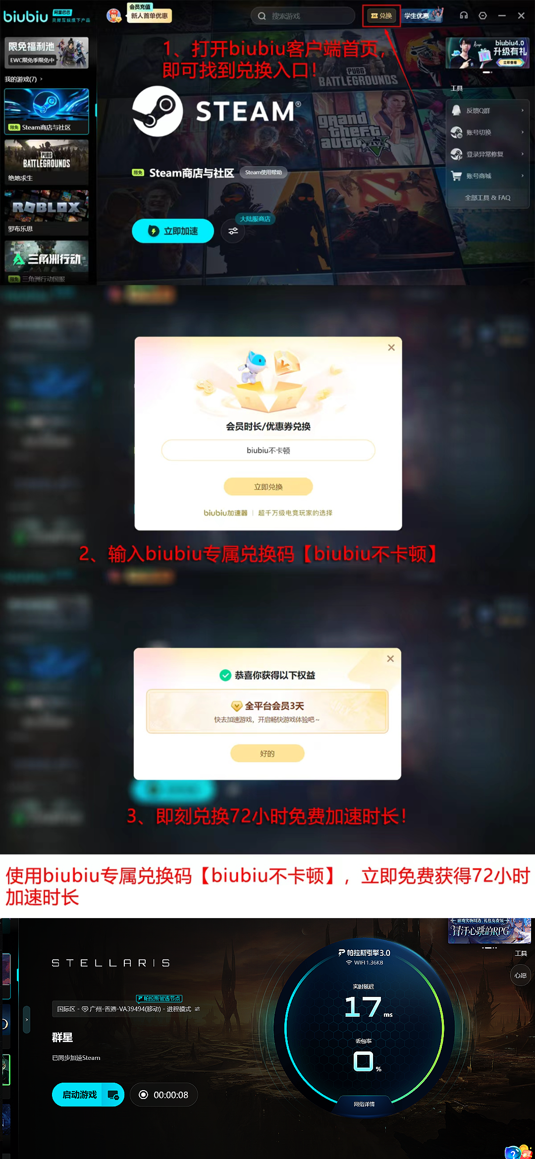 目前biubiu加速器面向全体用户开放限时福利:新用户注册即赠24小时全游戏免费加速权限;所有账号输入专属兑换码【biubiu不卡顿】,可额外领取3天连续加速时长。两项权益叠加,新手可累计获得96小时稳定低延迟体验,覆盖完整入门周期与首场竞技对战。
