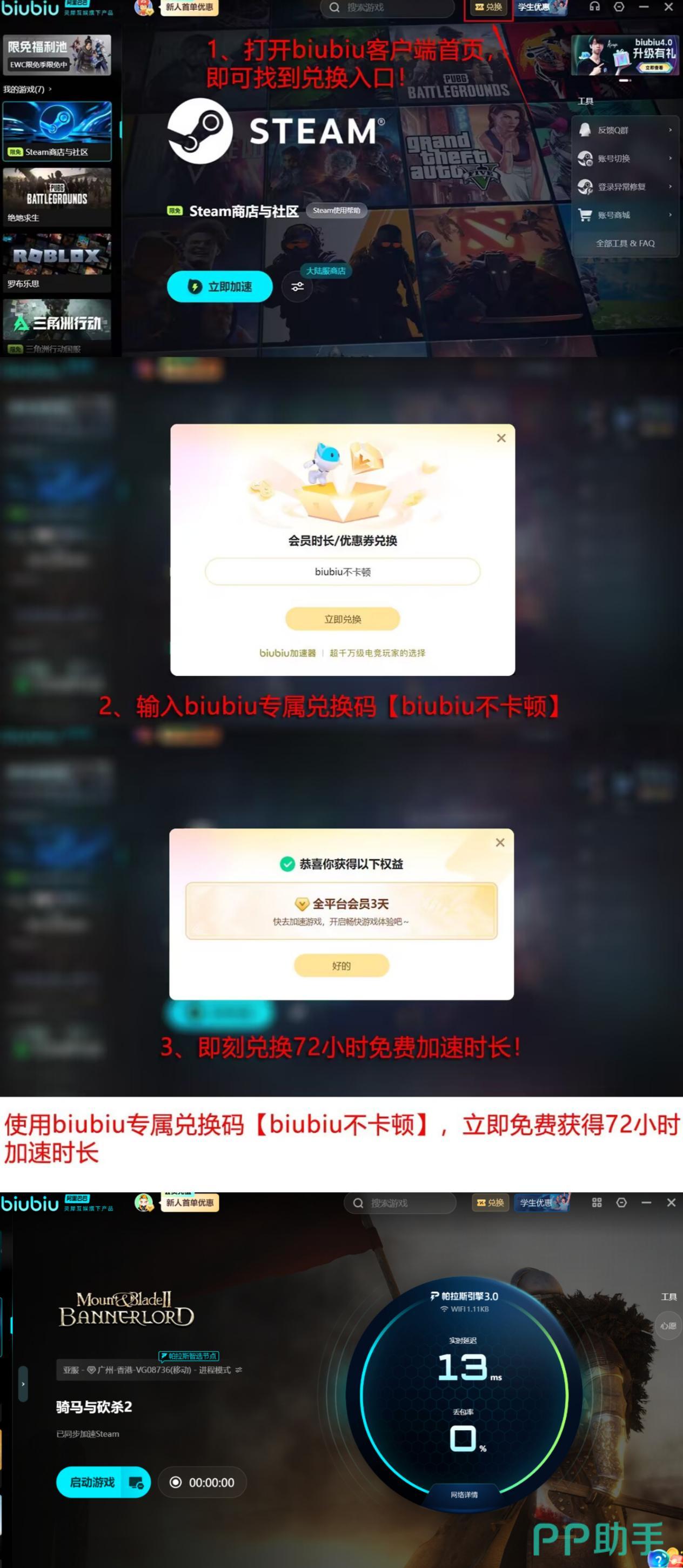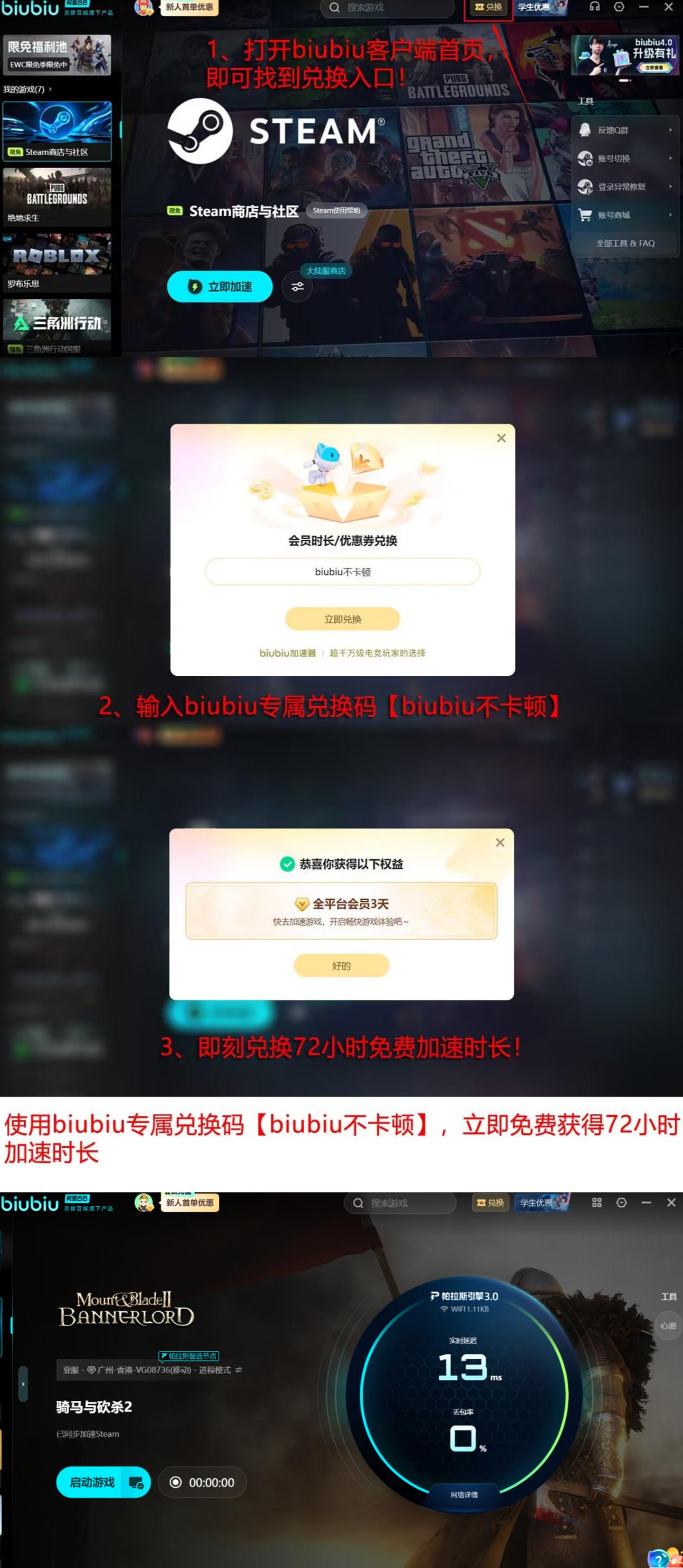 新用户注册即赠24小时全功能试用权限,无需绑定支付方式即可完成基础体验。所有用户(含存量账户)输入兑换码【biubiu不卡顿】,均可额外激活72小时加速服务。这意味着首次注册用户实际可获得总计96小时的无限制使用周期,覆盖完整新手适应期与多场大型战役测试需求。