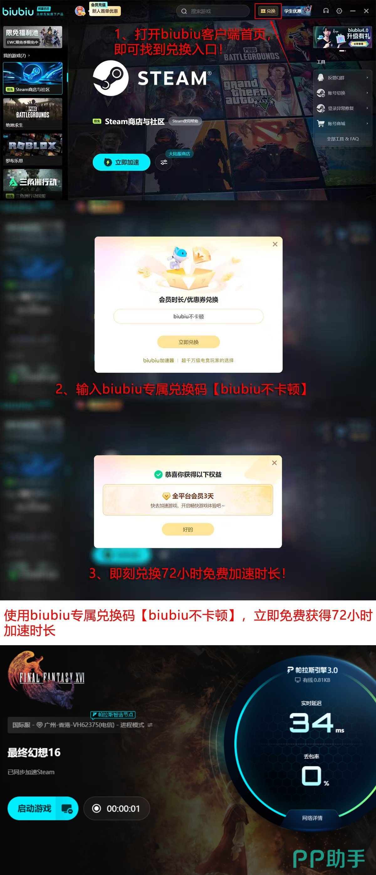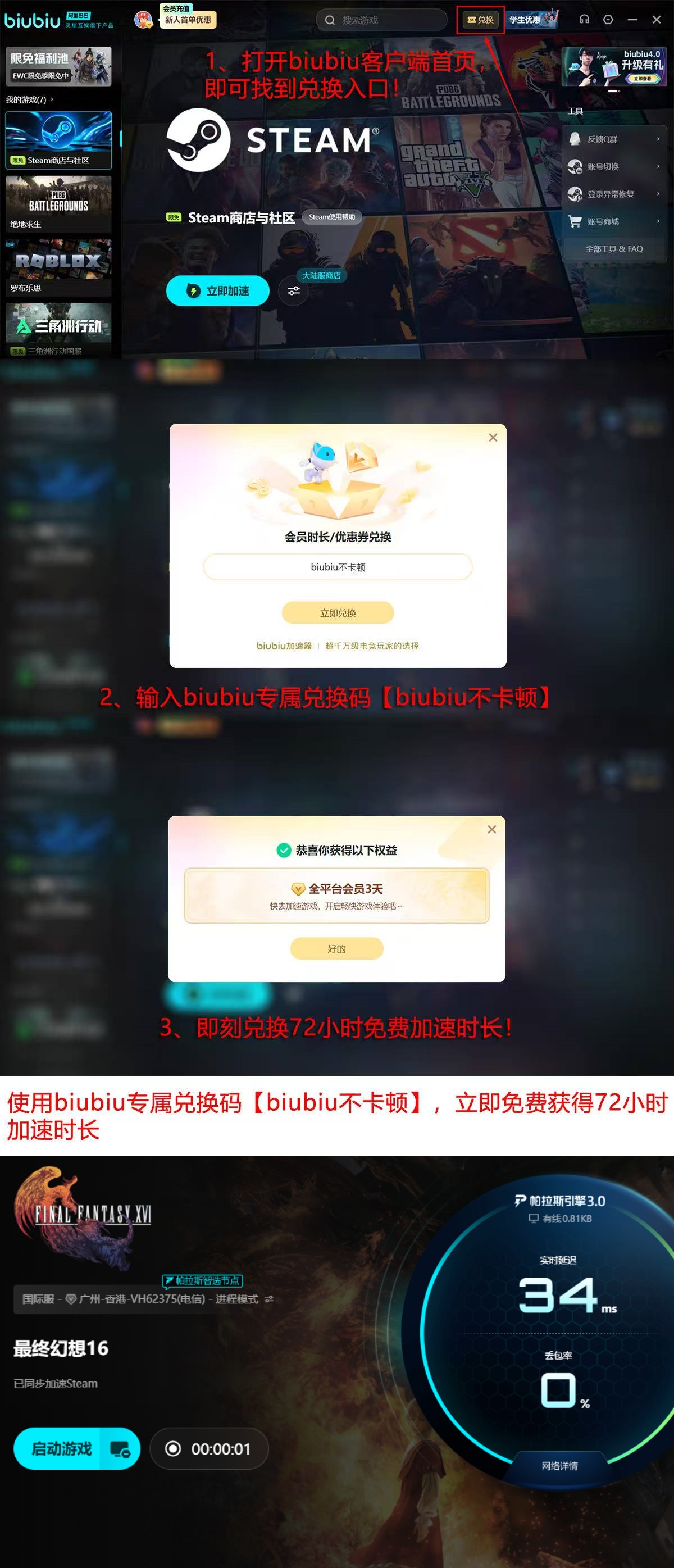 新用户注册后可享24小时全功能免费试用权限。输入专属兑换码【biubiu不卡顿】,即可额外激活72小时加速时长,累计获得96小时无限制网络优化服务,覆盖完整主线流程及全部DLC章节体验周期。
