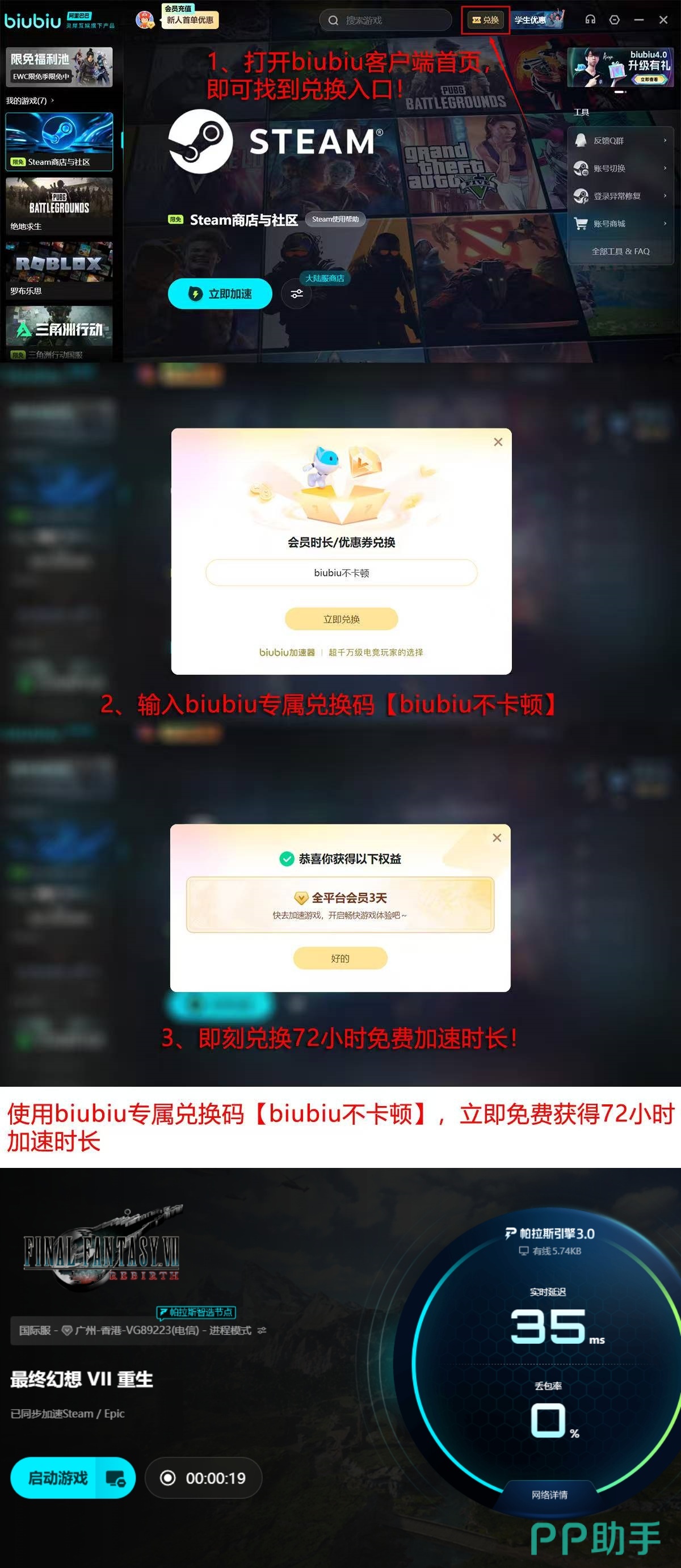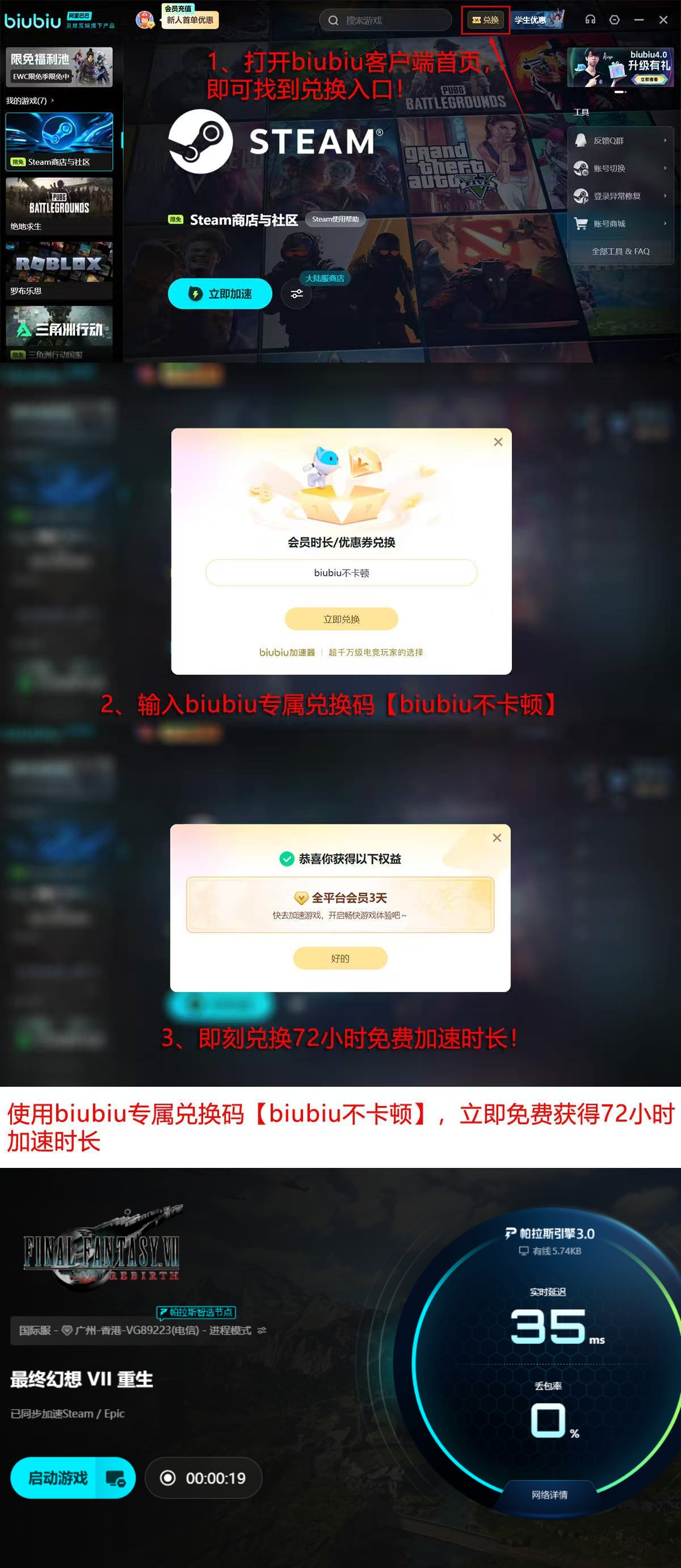 新用户注册后即可获得24小时无门槛免费加速时长;输入专属兑换码【biubiu不卡顿】,还可额外领取3天连续加速权益,累计享96小时免费使用权限,覆盖完整主线流程所需时长。