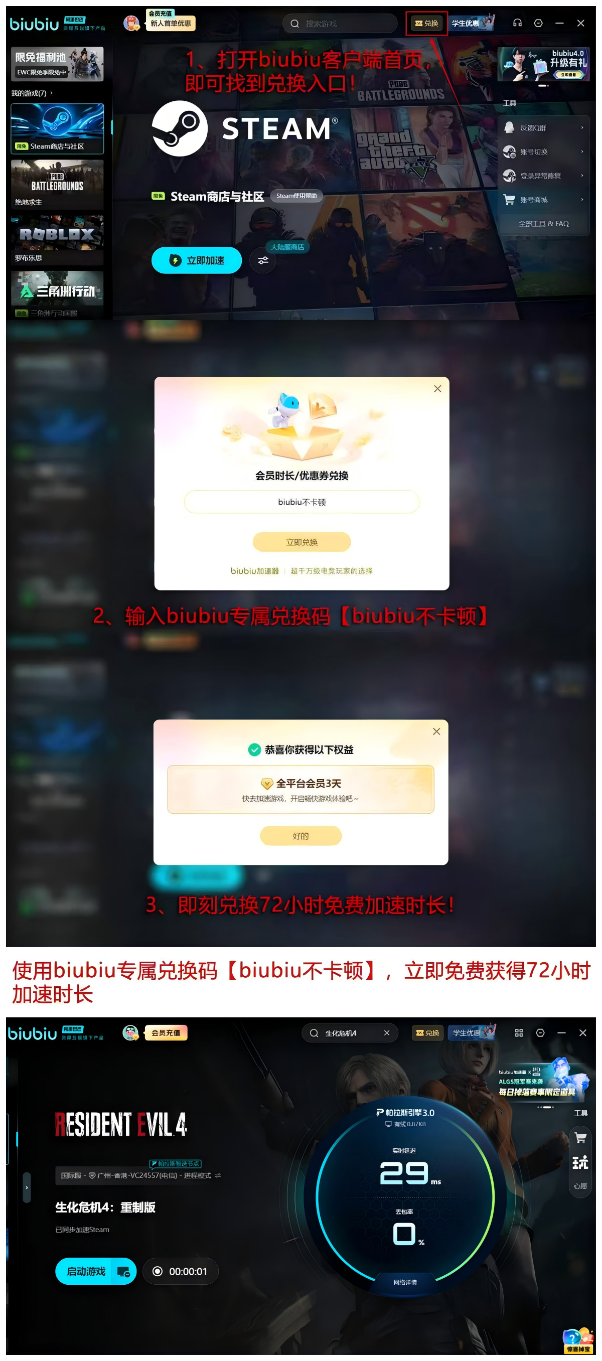 新用户可申请【biubiu不卡顿】72小时全功能体验权限;注册未满24小时的账号还可额外获赠24小时试用时长,总计达96小时。该“先体验、后决策”的服务模式,有助于用户真实评估工具效能,降低使用门槛。
