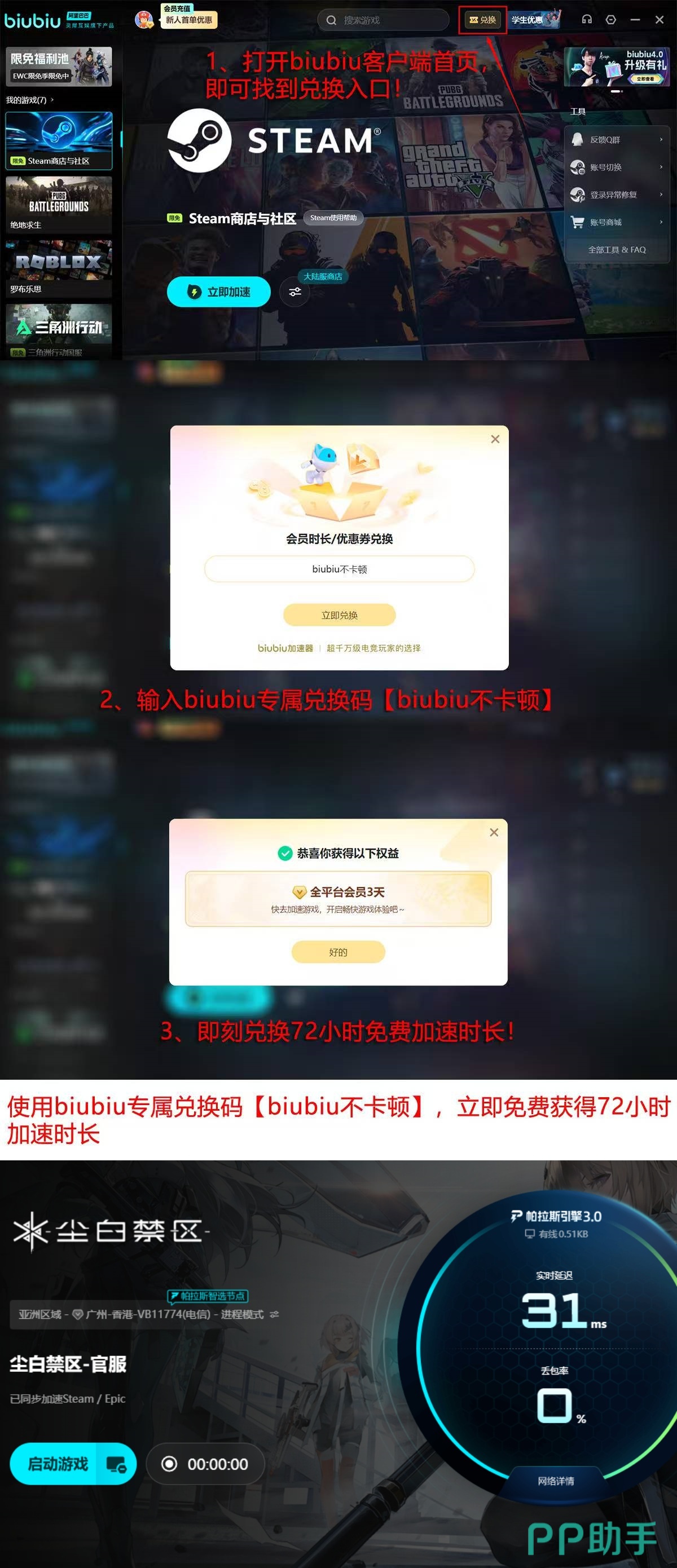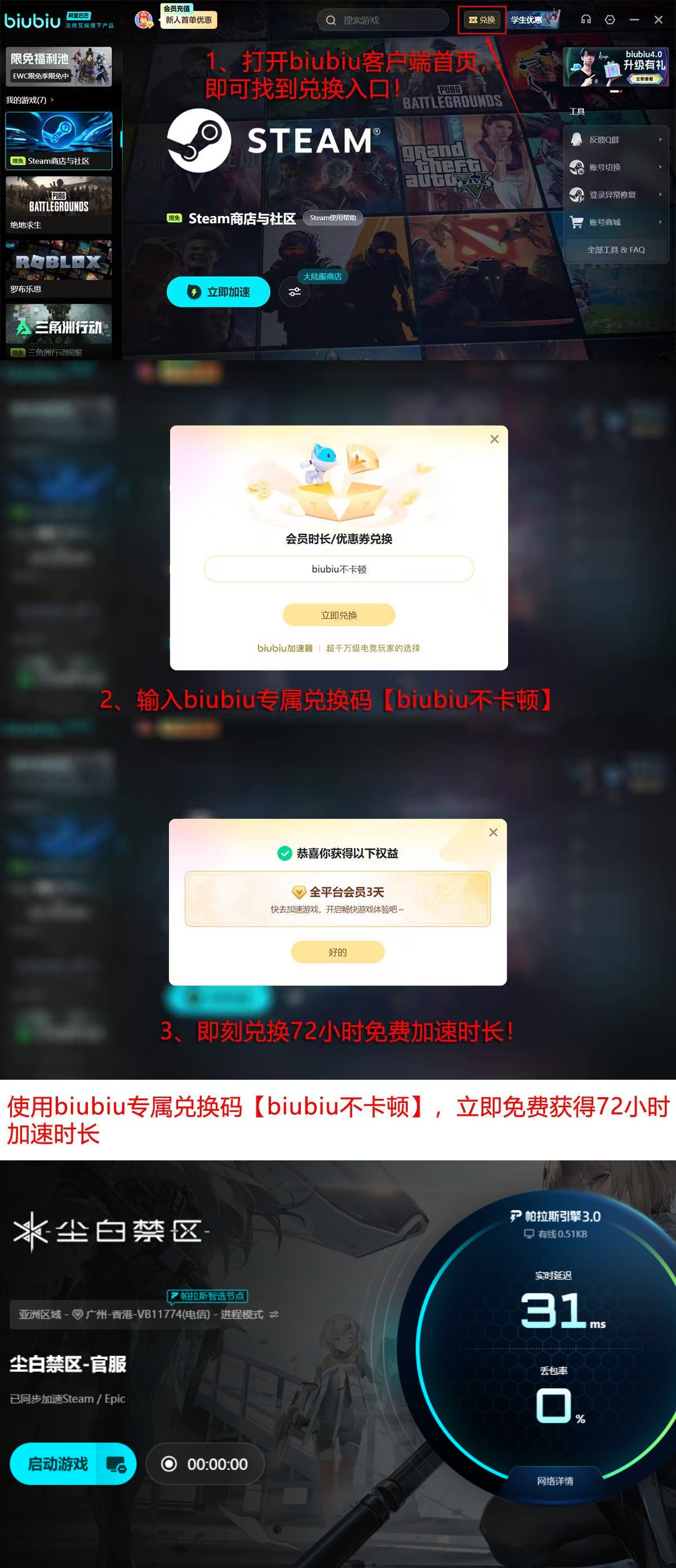 该工具面向所有玩家提供基础免费加速服务。新用户完成注册并首次登录后,系统自动发放24小时加速时长;此外,无论新老账户,均可在主界面输入指令“biubiu不卡顿”进行兑换,成功获取额外3天免费加速时长。两项权益叠加,总计可享4天超长免费体验期,充分验证产品效果后再决定是否升级,兼顾实用性与用户体验。