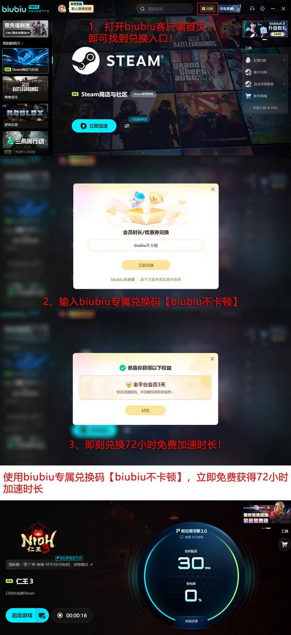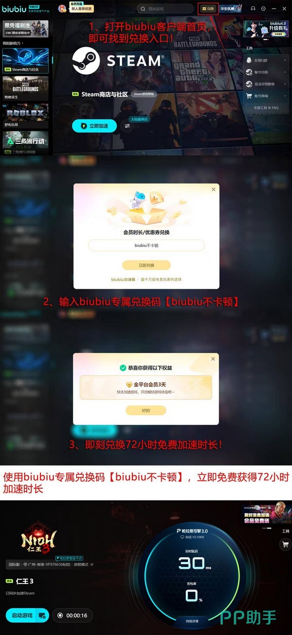 biubiu加速器由阿里巴巴灵犀互娱研发,与九游、交易猫同属其旗下产品矩阵。当前已升级至帕拉斯引擎3.0架构,支持动态链路优选与协议层深度优化。该版本经职业电竞选手xdd实测验证,在《绝地求生》等高并发联机场景中表现稳定。新用户注册后可享24小时基础体验时长,叠加输入口令“biubiu不卡顿”还可额外获得72小时服务权限,总计达96小时。即日起至2月13日,《仁王3》玩家可享受专属限免加速权益。