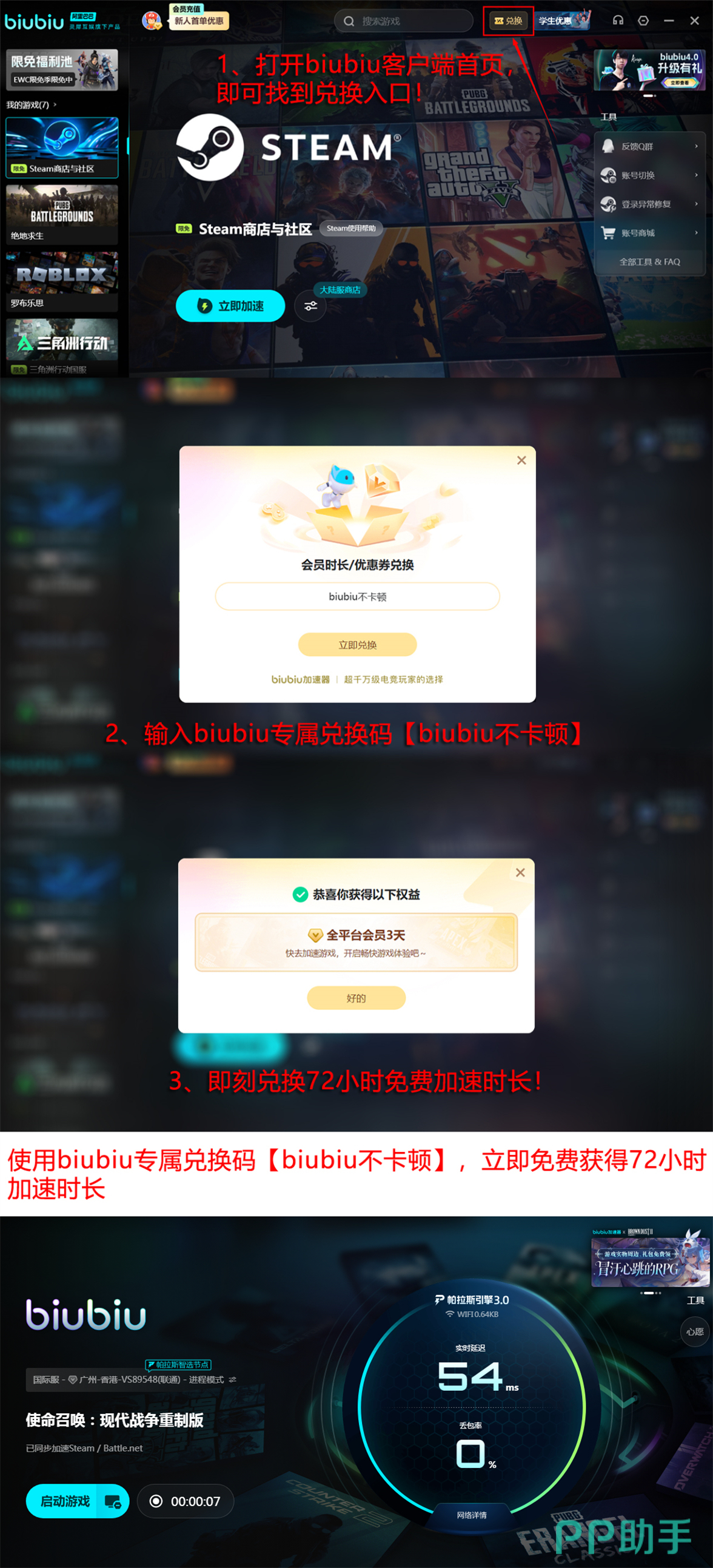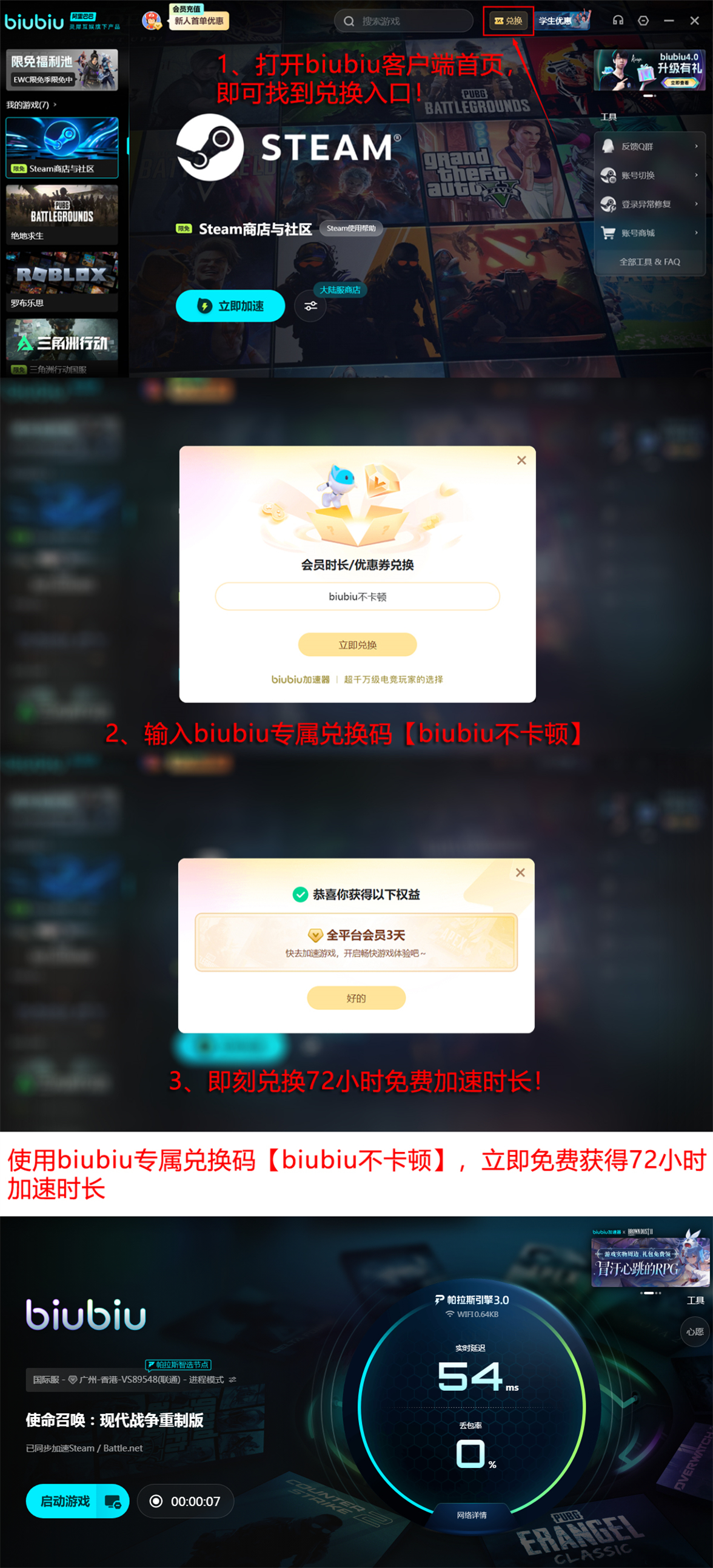 目前biubiu加速器采用会员制服务机制,基础功能免费开放,高级加速节点需开通会员权限。为降低用户试用门槛,官方同步推出限时福利政策:所有账号均可凭兑换码【biubiu不卡顿】领取72小时全节点加速时长;新注册用户首次登录即享24小时免付费加速权益。两项权益叠加使用,总计可获得96小时无限制加速服务,充分覆盖新手适应期与高强度对战需求。