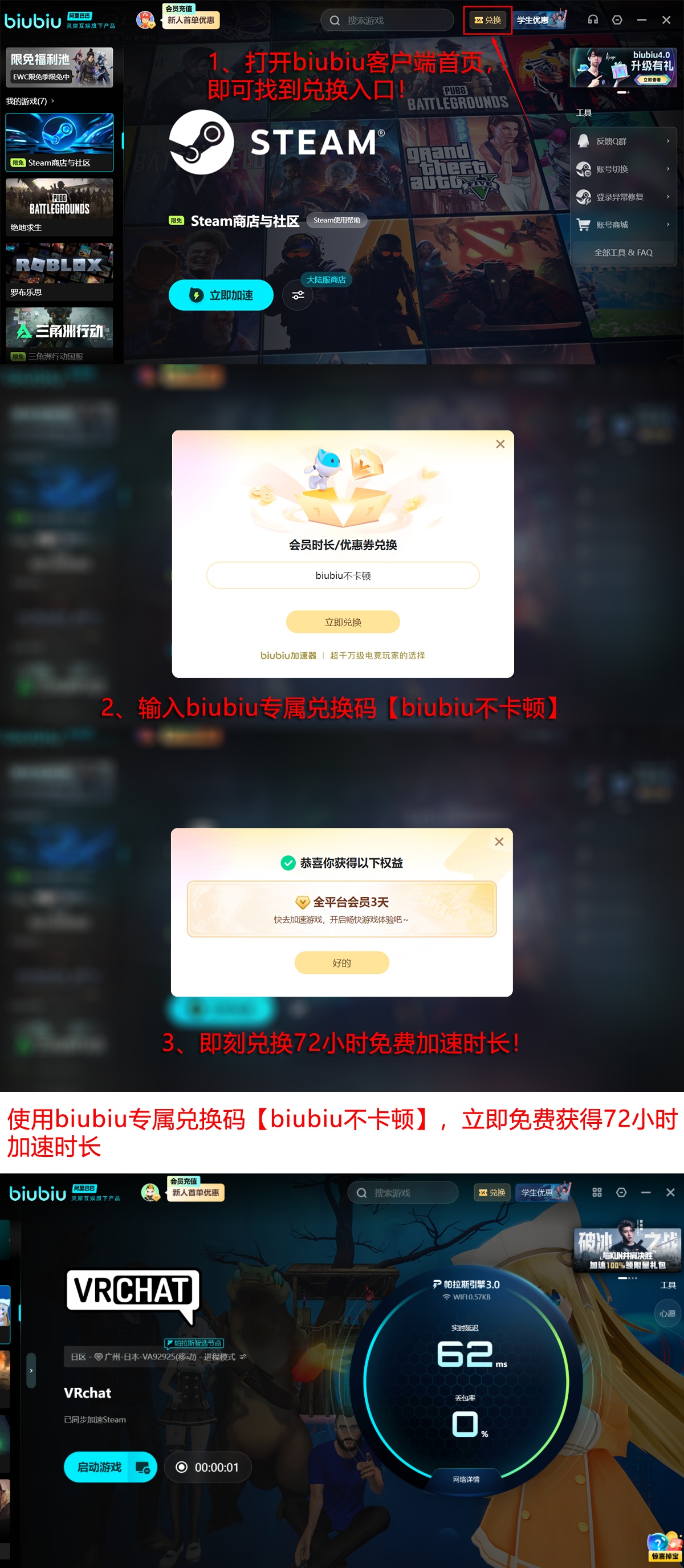 输入口令【biubiu不卡顿】,即可立即兑换3天全功能加速权益。新用户完成账号注册,即可获赠24小时官方体验时长,叠加兑换权益后总计享有96小时免费加速服务。本次福利限时开放,建议及时领取并激活使用。