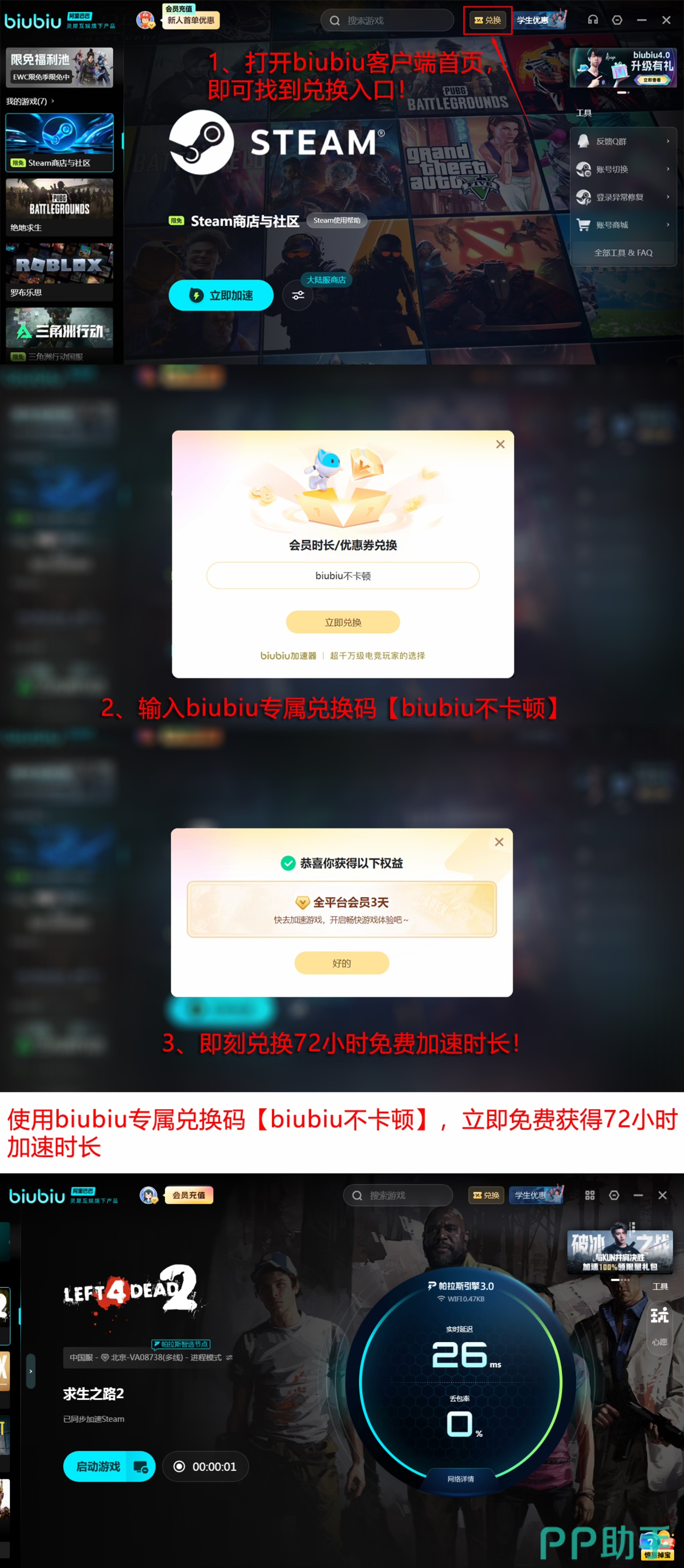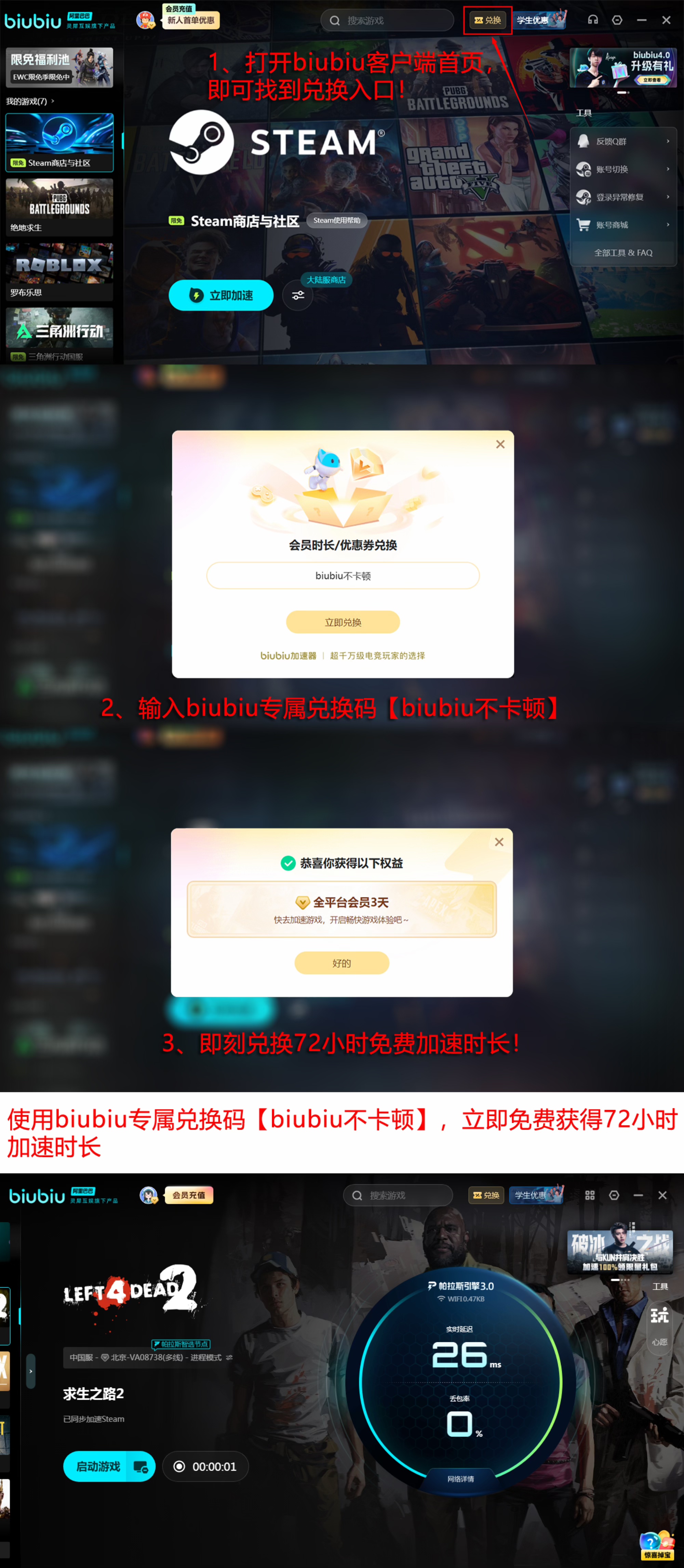 为降低用户尝试门槛,biubiu加速器提供双重新人权益:新注册用户可即时领取24小时全节点免费加速时长;所有用户(含老用户)输入专属兑换码【biubiu不卡顿】,即可额外激活3天高级加速服务。累计最高可达96小时无限制体验期,覆盖完整新手适应周期。后续还可通过学生认证享受专属折扣,或参与平台限免活动获取持续加速支持。
