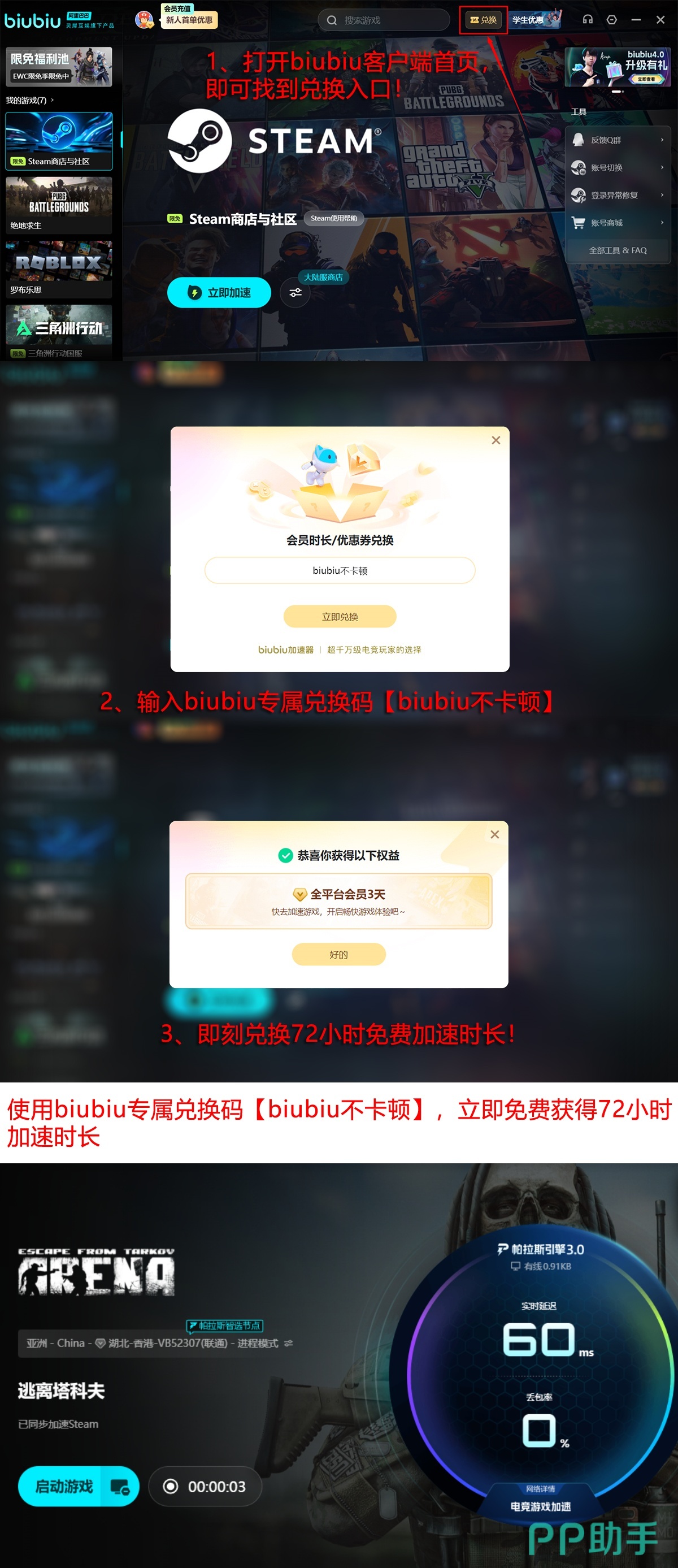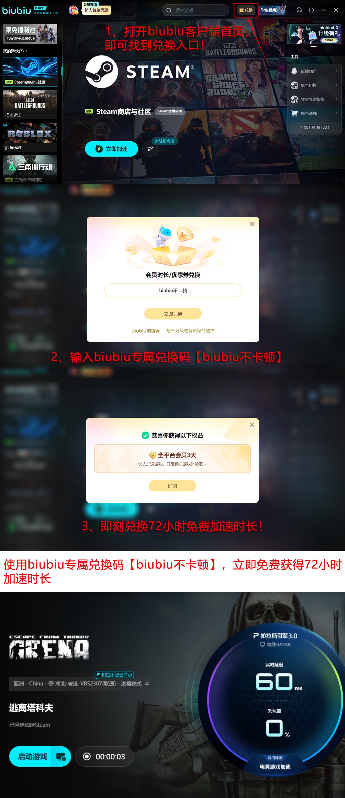 新用户注册即可获赠24小时全游戏加速权益,无需绑定支付方式或完成复杂任务;所有用户还可凭兑换码【biubiu不卡顿】额外领取3天加速权限,累计最高可享96小时深度体验周期。在此期间,支持包括《逃离塔科夫》在内的数百款国内外热门游戏一键启动加速,全程无广告干扰,后台资源占用率控制在行业较低水平。