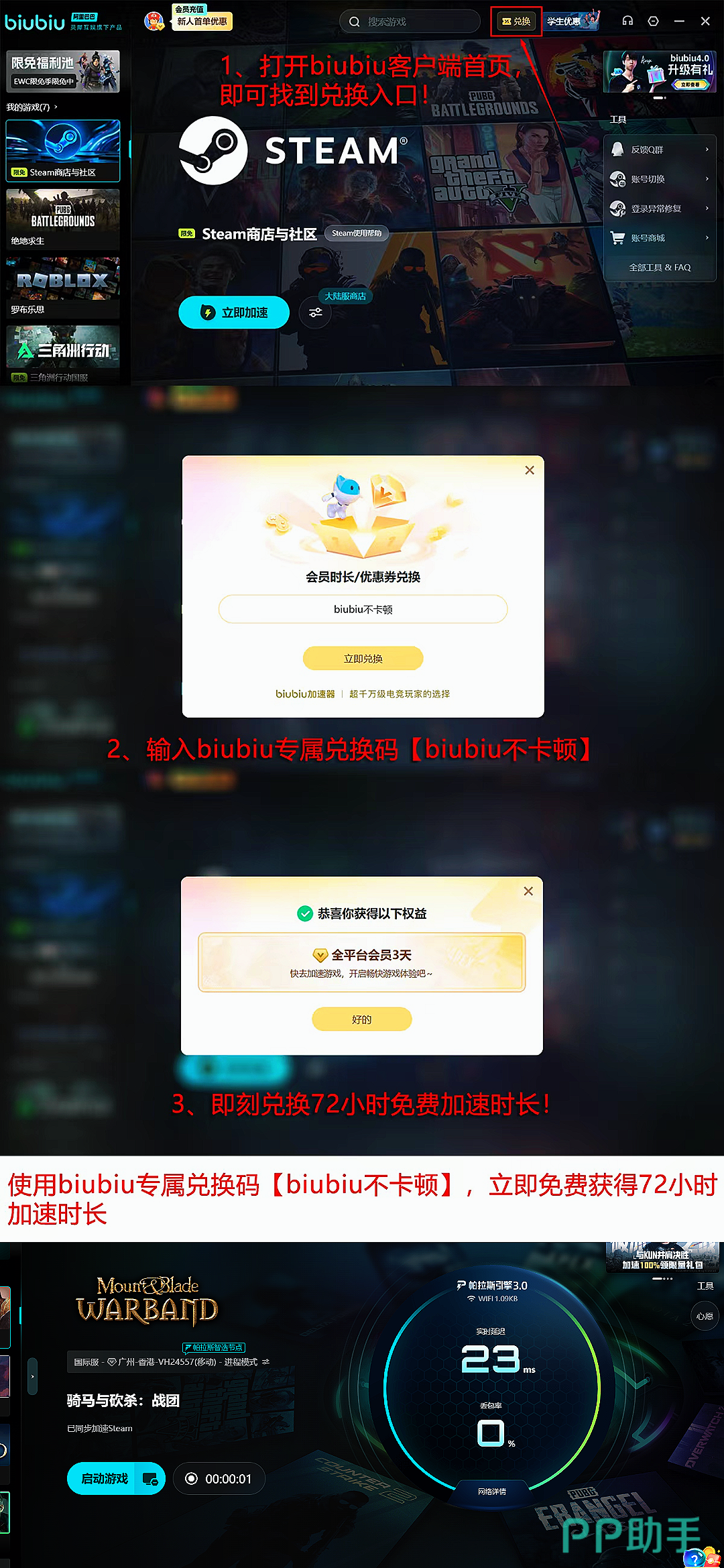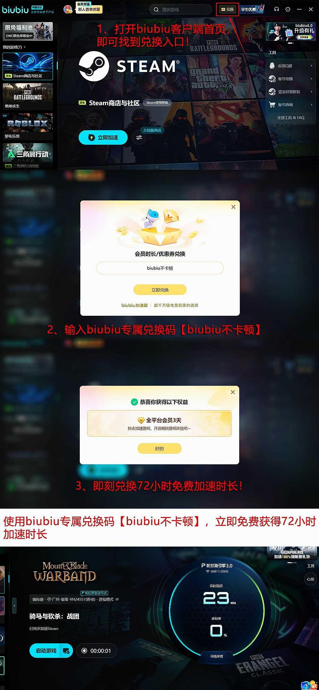 除基础加速能力外,该工具在服务维度亦具备完善保障体系。新注册用户可立即获得24小时全游戏免费加速权限,覆盖包括《骑马与砍杀:战团》在内的全部联机作品。同时,输入通用激活码【biubiu不卡顿】,无论新老账户均可额外领取3日连续加速权益,总计享有多达96小时无限制使用时长。