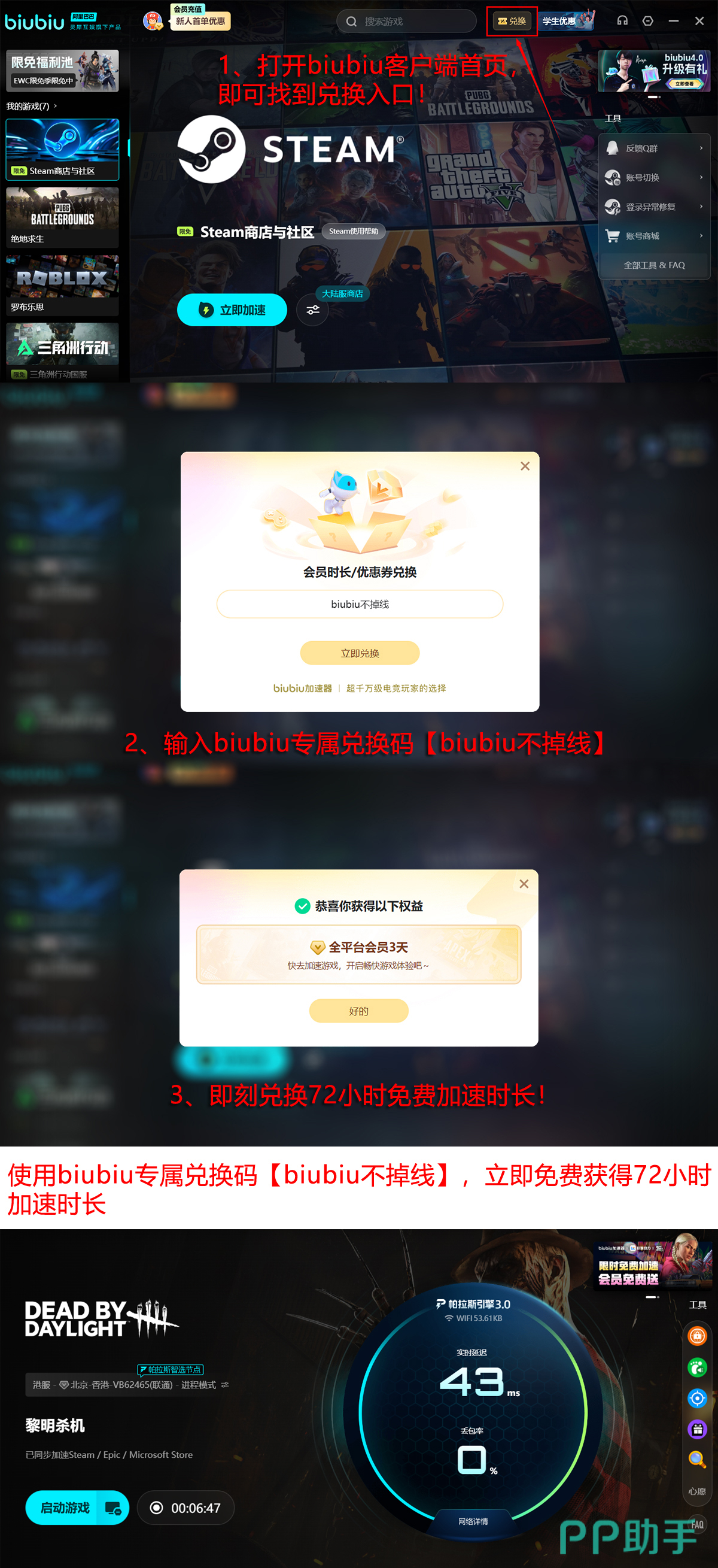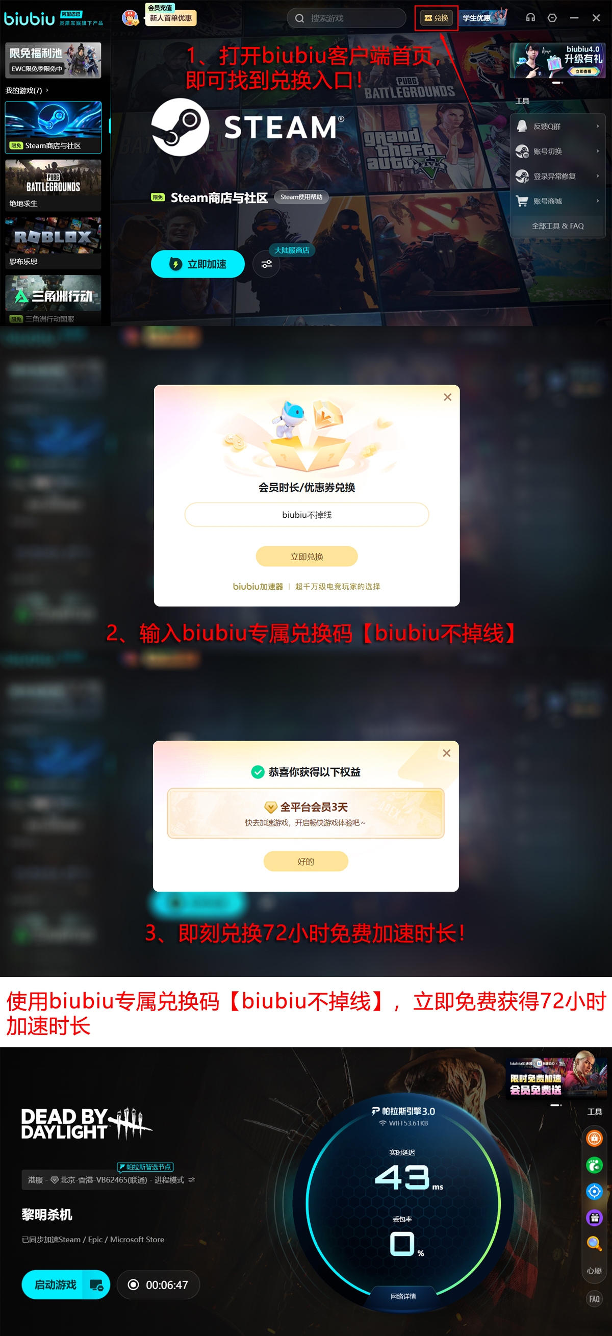 新用户注册即可获得24小时免费试用权限;输入专属激活码【biubiu不掉线】,还可额外领取3天加速时长。累计共96小时免费体验时间,充分满足深度测试与多局实战验证所需。