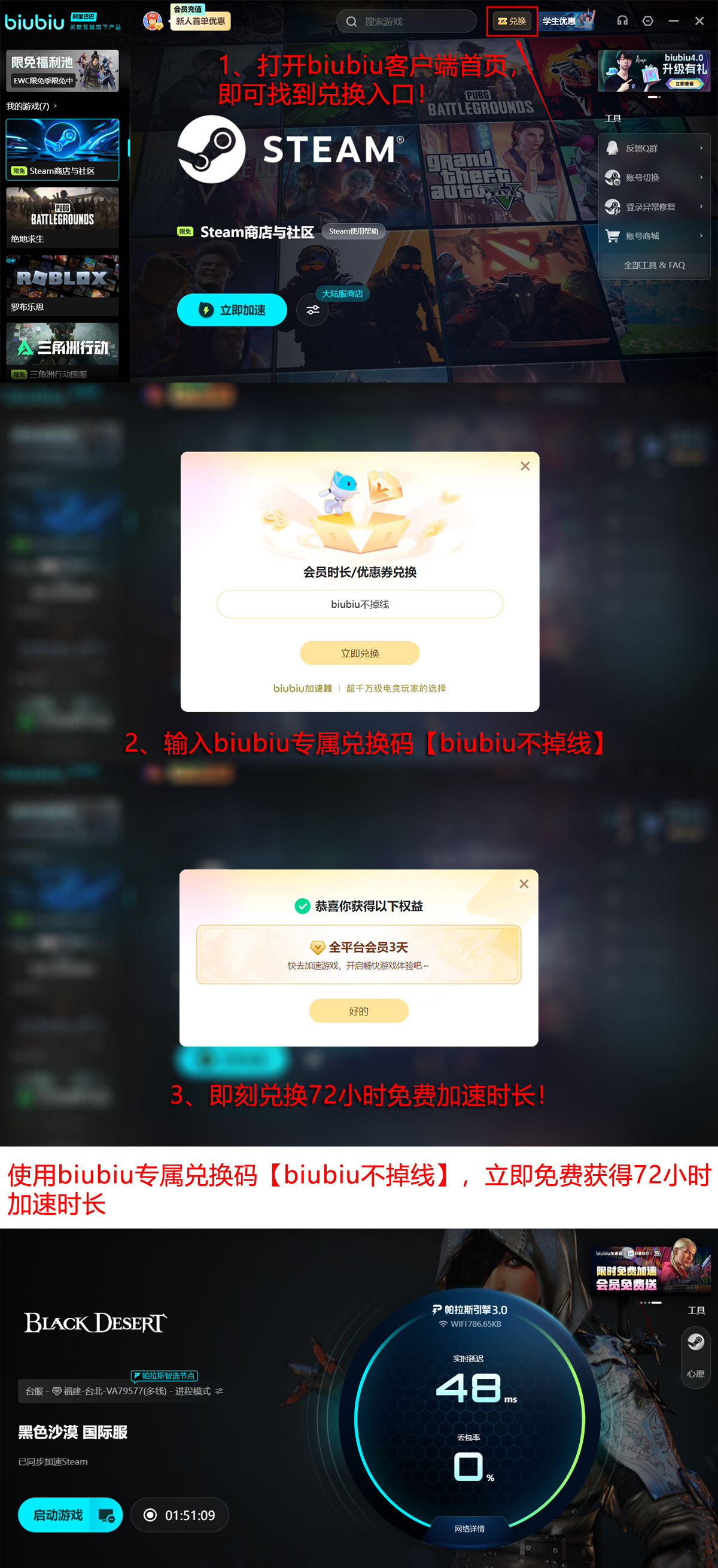 新用户注册即可获赠24小时免费使用时长;完成注册后输入激活码【biubiu不掉线】,额外领取3天使用权。两项叠加总计可享96小时无限制体验。
