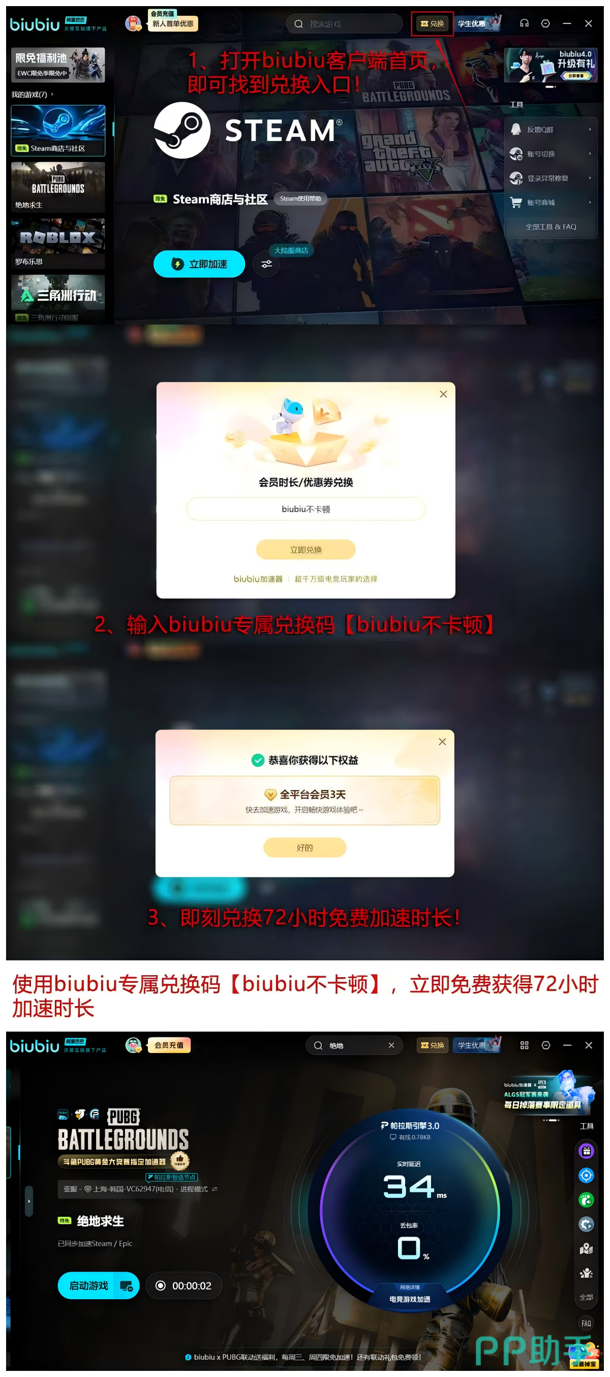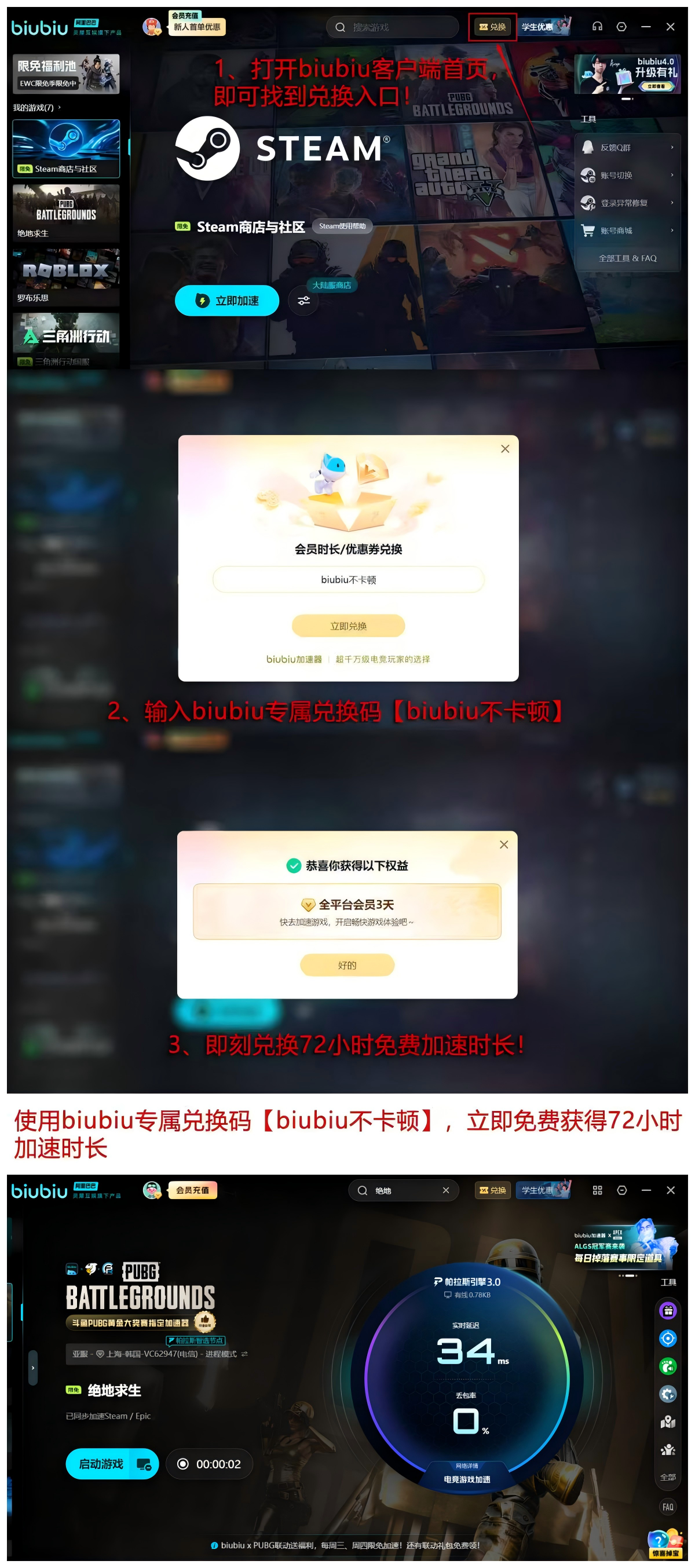 新用户首次激活可输入口令【biubiu不卡顿】,立即获得72小时高级加速时长,叠加注册即赠的24小时基础权益,总计享96小时无限制使用权限。当前活动同步开放限时免单通道,符合条件的用户可享受多端设备共享加速服务,切实提升多场景联机稳定性。