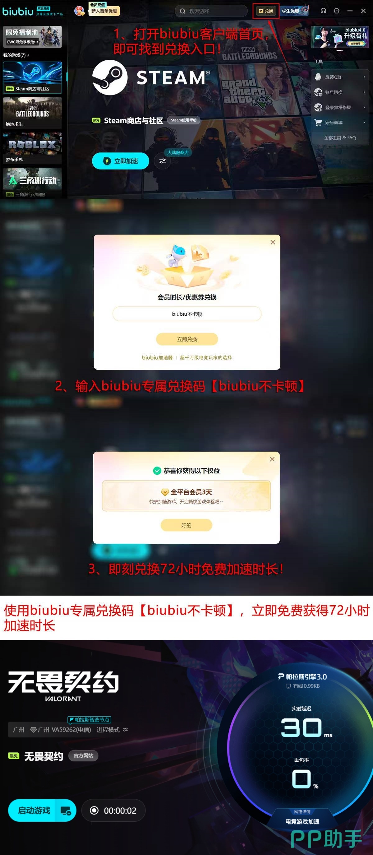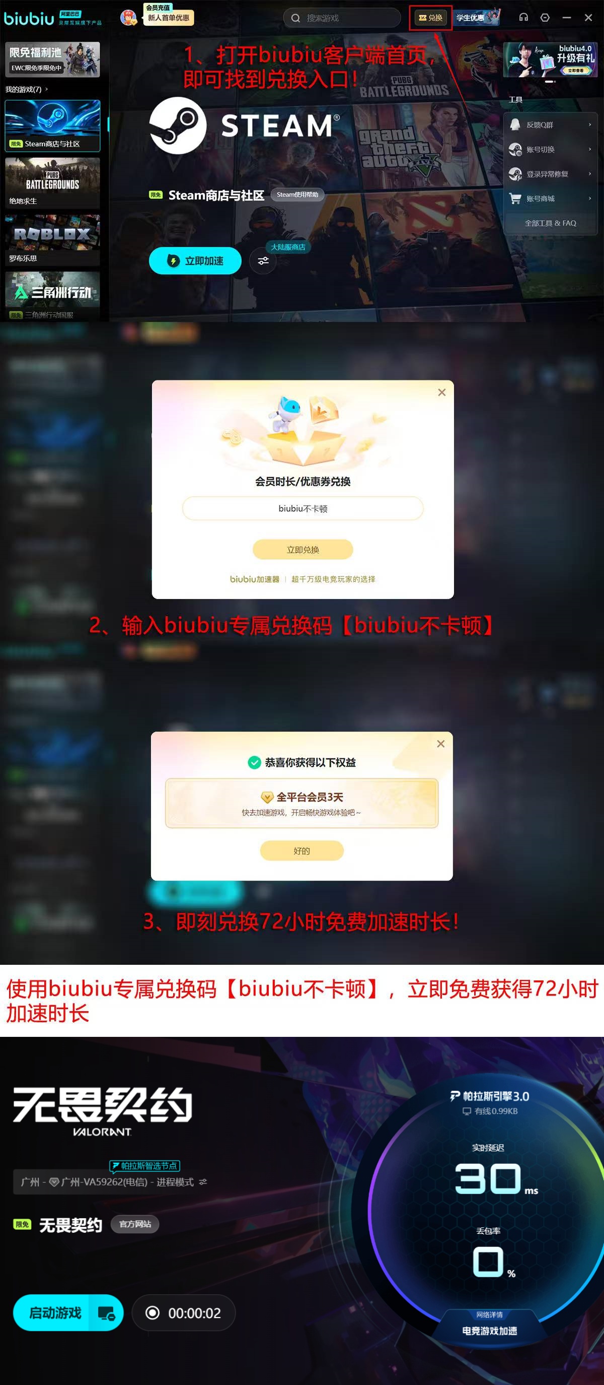 新用户注册即享24小时免费加速时长;输入专属兑换口令“biubiu不卡顿”,还可额外领取72小时加速权益,总计96小时免付费体验。该福利面向首次使用用户开放,助力玩家零门槛验证实际加速效果。