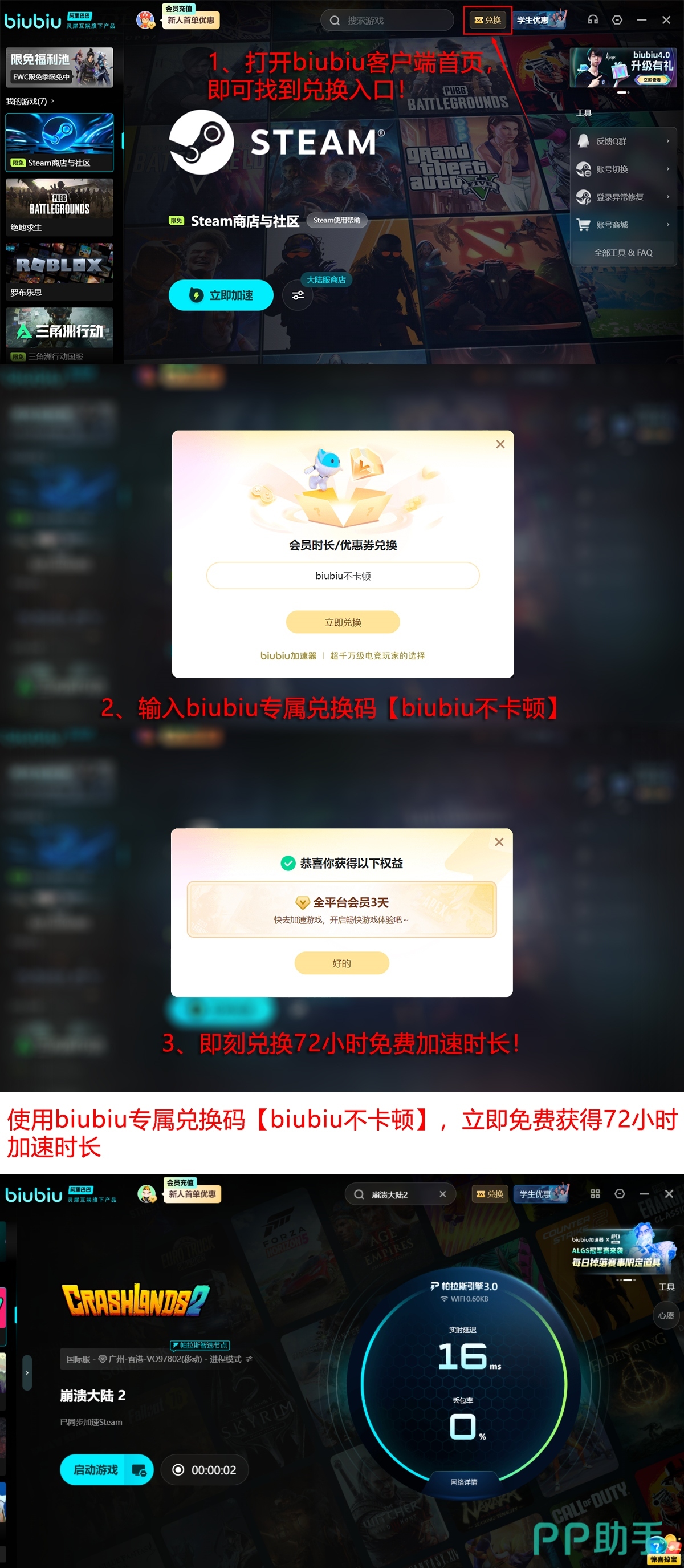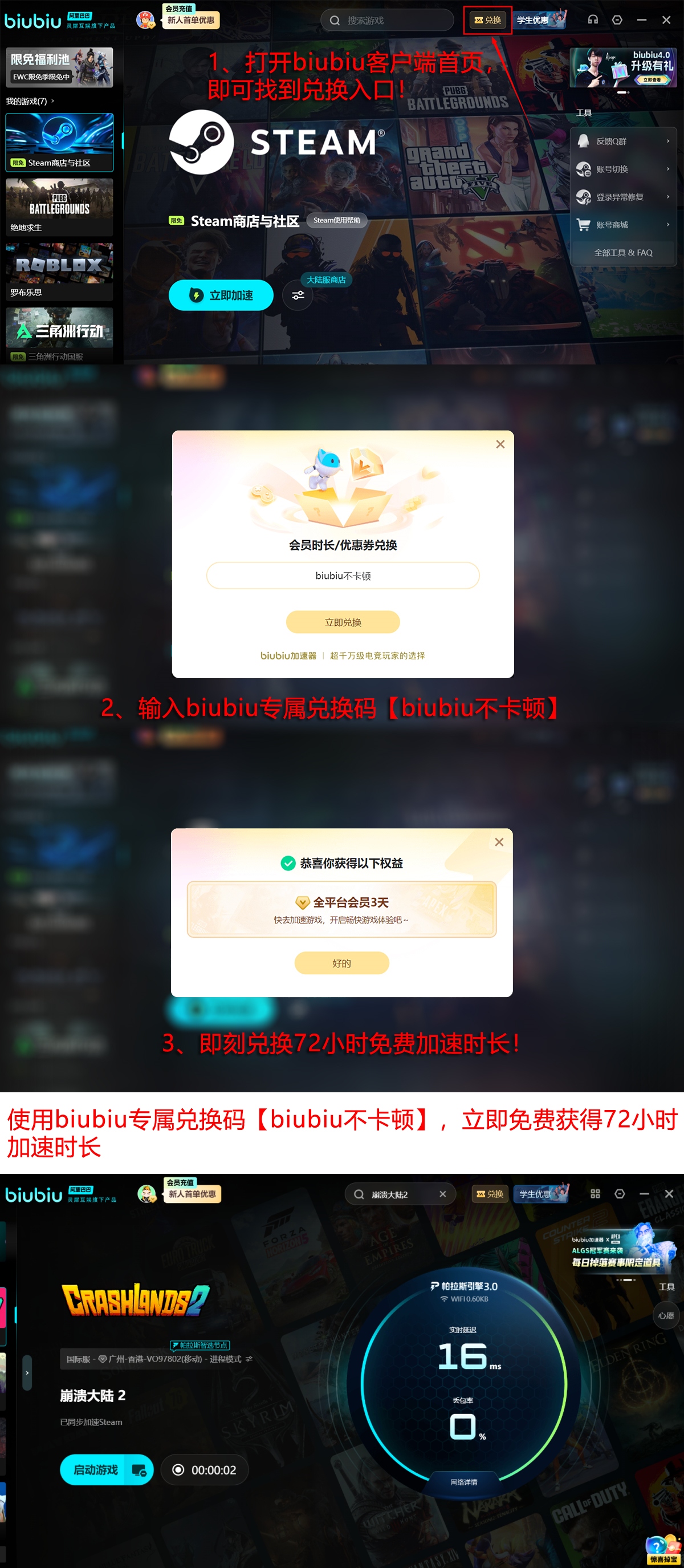 为降低新用户使用门槛,官方推出多项新手权益:注册即赠24小时全功能免费试用时长;登录后输入口令【biubiu不卡顿】,还可额外兑换连续三天加速服务。所有功能无隐藏限制,支持全流程覆盖——从道具合成、地图探索到Boss联机协作,确保开放世界生存体验流畅无断点。