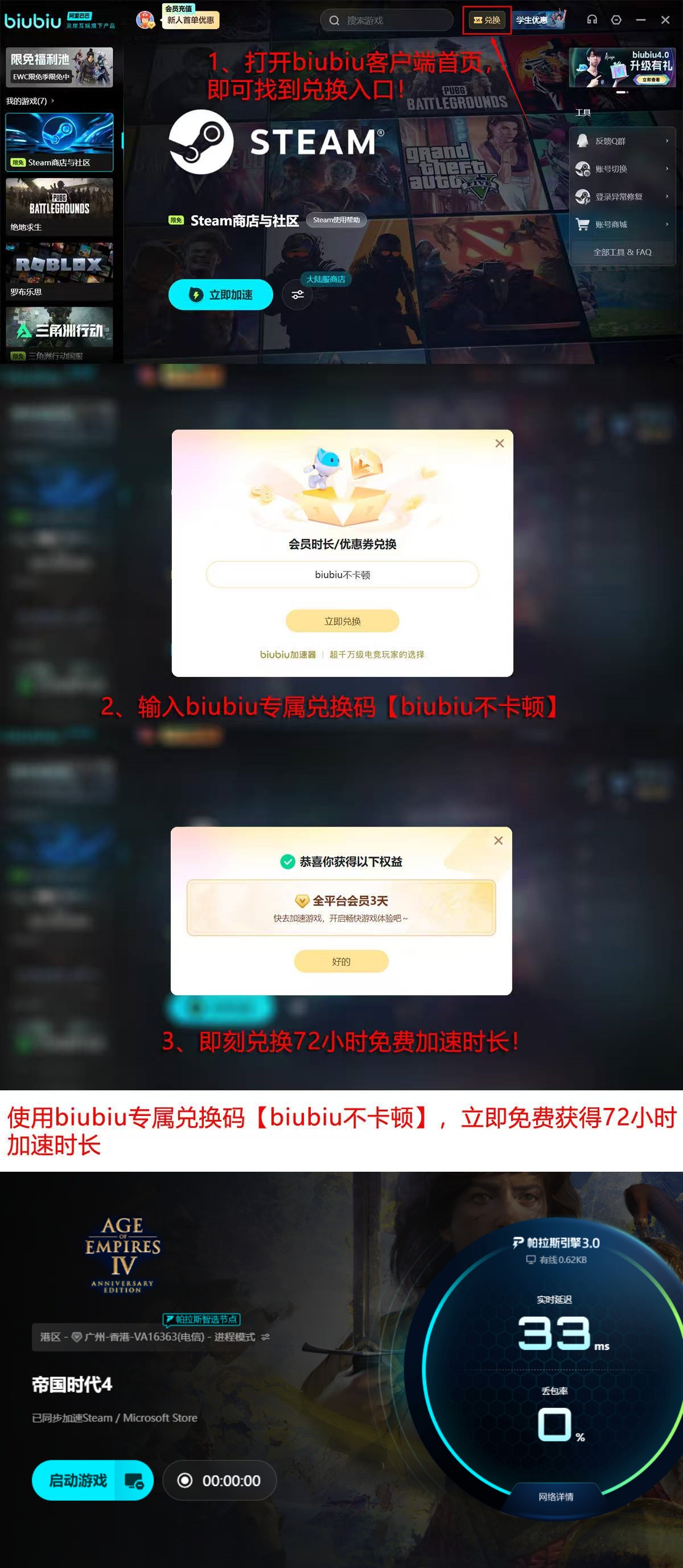 目前新用户注册即可获得24小时全功能免费试用权限;输入兑换口令“biubiu不卡顿”,还可额外领取72小时加速时长,总计可无门槛连续使用达96小时,无需绑定支付方式或完成任务限制。