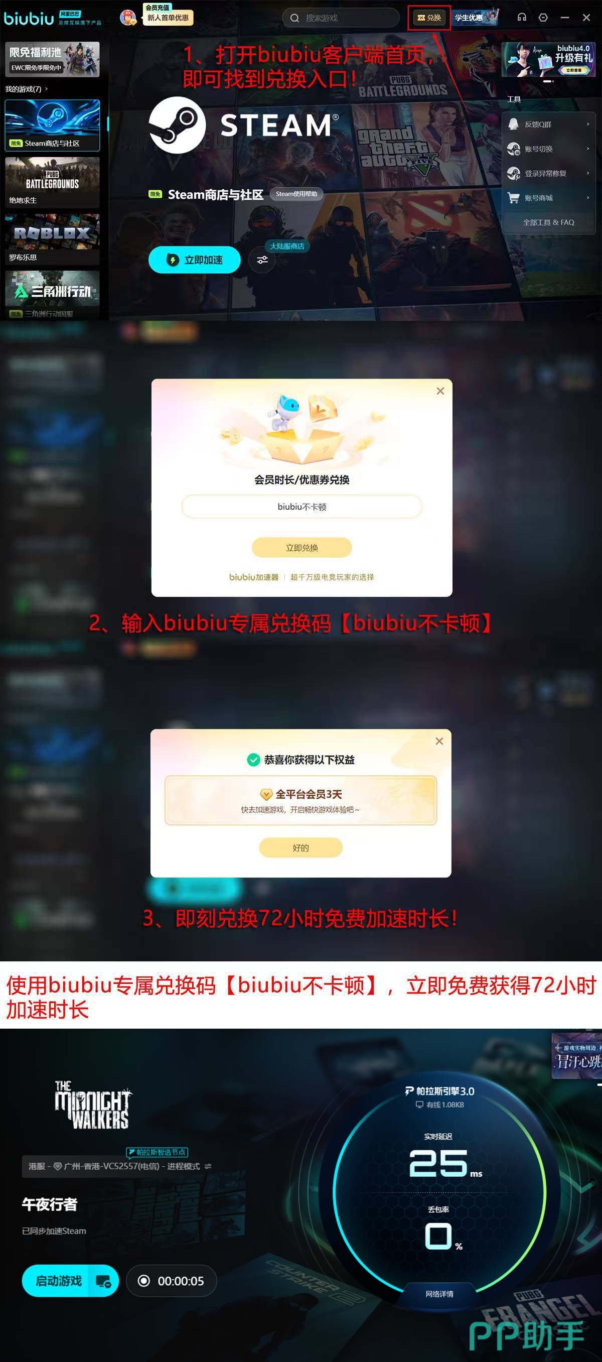 为便于用户直观评估优化效果,biubiu加速器开放4天全功能试用权限:新注册用户自动获赠24小时体验时长;登录客户端后进入首页“兑换”入口,输入激活口令【biubiu不卡顿】,即可额外领取72小时服务,累计共96小时无限制使用周期。