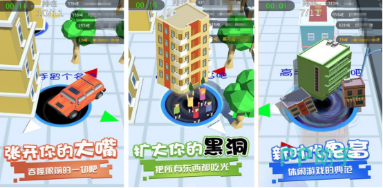 主打的就是黑洞吞噬的题材,开局之后大家将要化成一个小小的黑洞,一开始体积特别小,只能吞噬各种体积较小的物体,比如在城市当中只能将小人物或者是自行车全部吞噬进去,随着吞噬的物体越多之后也会让自己的体积变得越来越大,最终就可以轻而易举吞噬更大的物体,包括高楼大厦都无一幸免,其次还支持多人对战模式,可以和其他人进行较量及时躲避比自己大的黑洞。