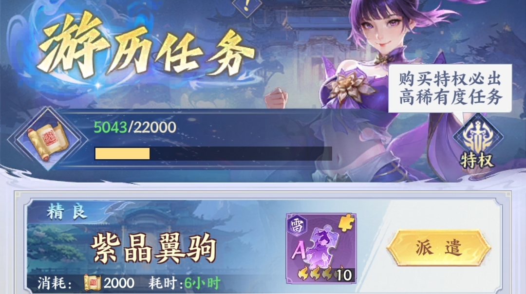 新手流程中同步开放,消耗【游历值】派遣斗者执行任务,奖励涵盖【金币】、【紫晶卡】及各阶【斗者碎片】。购买游历特权后,刷新任务池时将确保出现紫色品质任务,显著提升高价值产出概率。