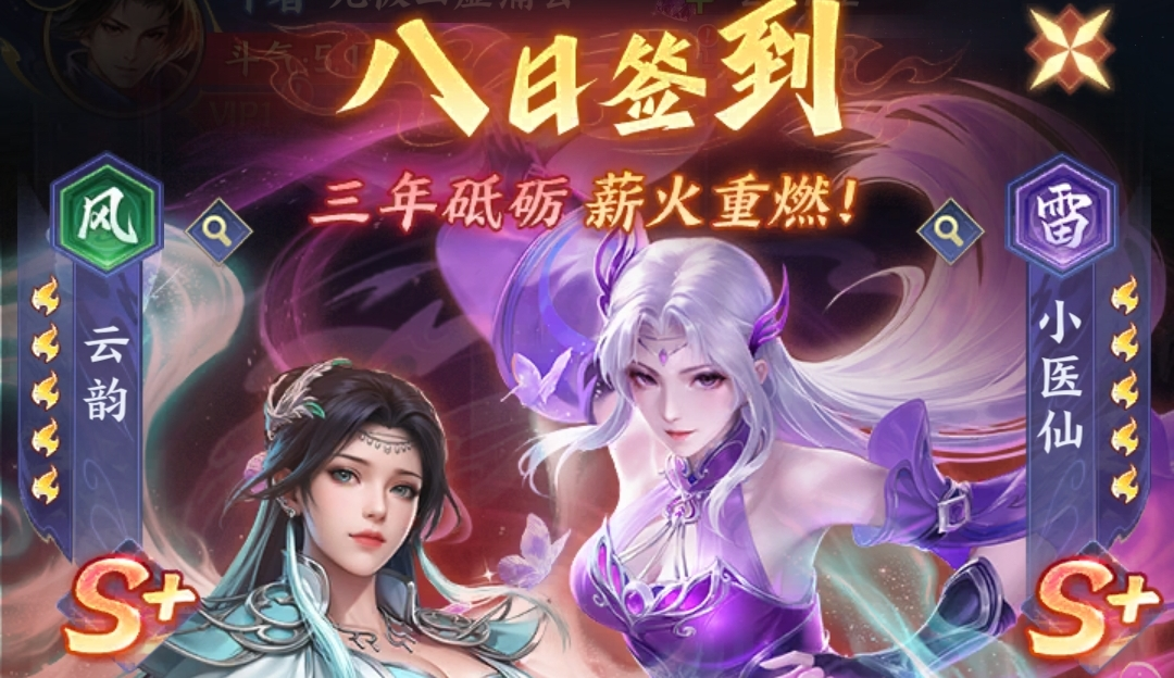 主城界面直达,每日登录赠送【紫晶卡】、【玄铁】、【征召玉兆】等资源;第2天可选定S+斗者云韵,第8天可选定S+斗者小医仙,实现关键角色精准补强。