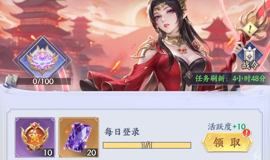 主角达10级后解锁,每日完成固定任务可积累【活跃点】,满100点后可领取【征召玉兆】,同时获得【金币】、【紫晶卡】及其他养成材料。