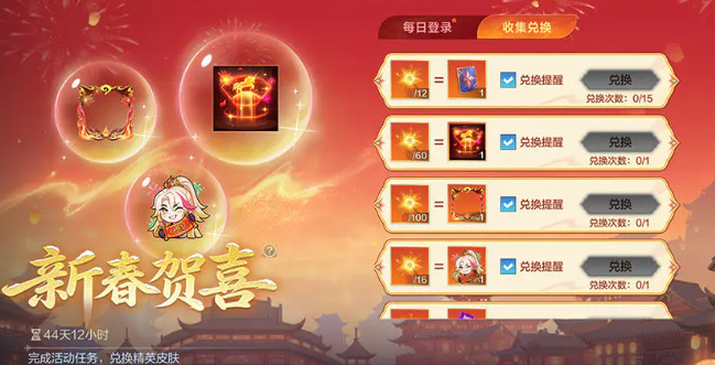 从2月17日开始,只要登录游戏就可以领取代币,免费兑换到一个“福泽宝箱”,将宝箱打开能随机获得1个皮肤,此外春节主题皮肤也将上架,大家可以享受到首周7折的福利。