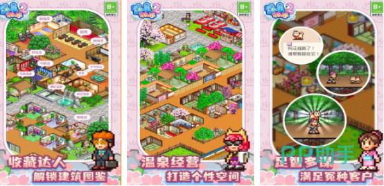 玩家可成为温泉旅馆当中的老板,要合理经营,满足更多顾客需求,自行设计装修各类温泉,让顾客感受到更好的服务,真实还原温泉旅馆的状态,可感受无限乐趣,足部温泉、露天温泉等,还有小卖部,超过10种不同的特色设施,全部都可根据个人的实际喜好去摆放,合理布局,提高顾客的满意程度。