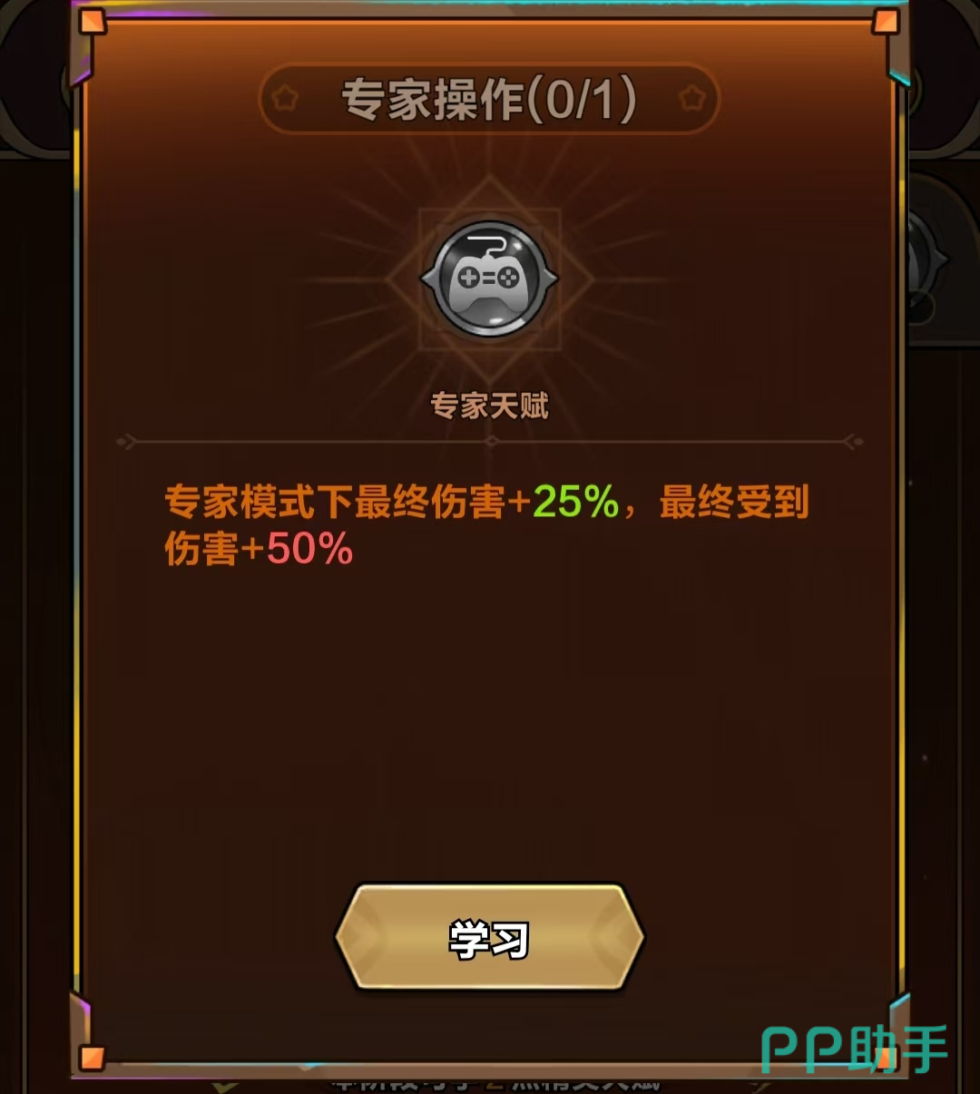 【专家操作】为独立激活型天赋,不占用常规天赋点,启用后提供最终伤害+25%加成,但同步承受最终受到伤害+50%的代价。建议新手阶段暂不启用;中后期操作熟练度提升、装备成型后,可作为输出强化手段开启;冲击全服排行榜时,该天赋属于必选配置。