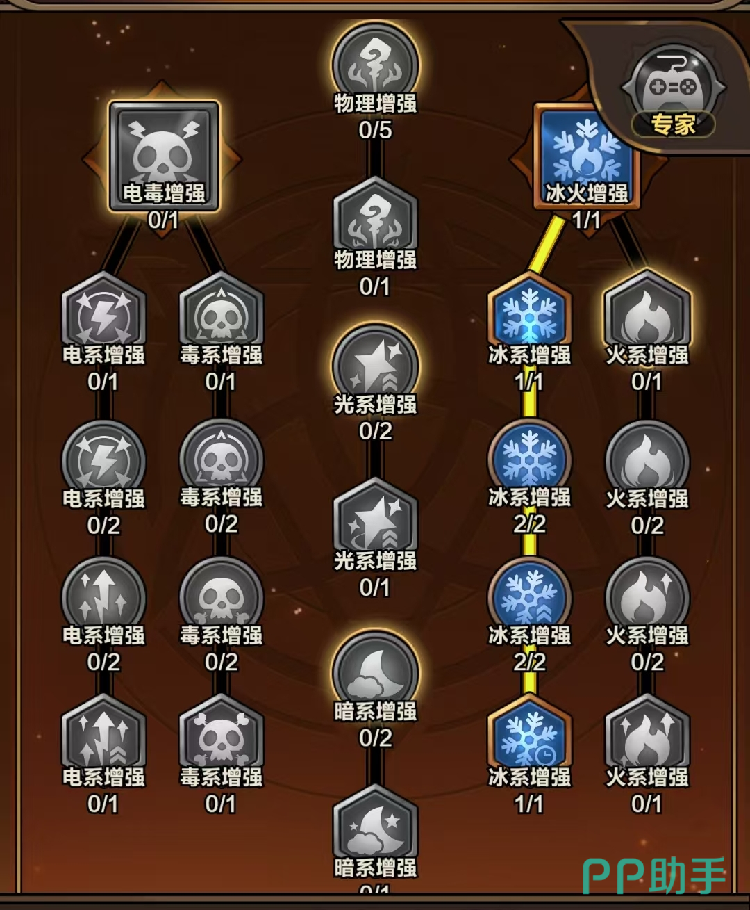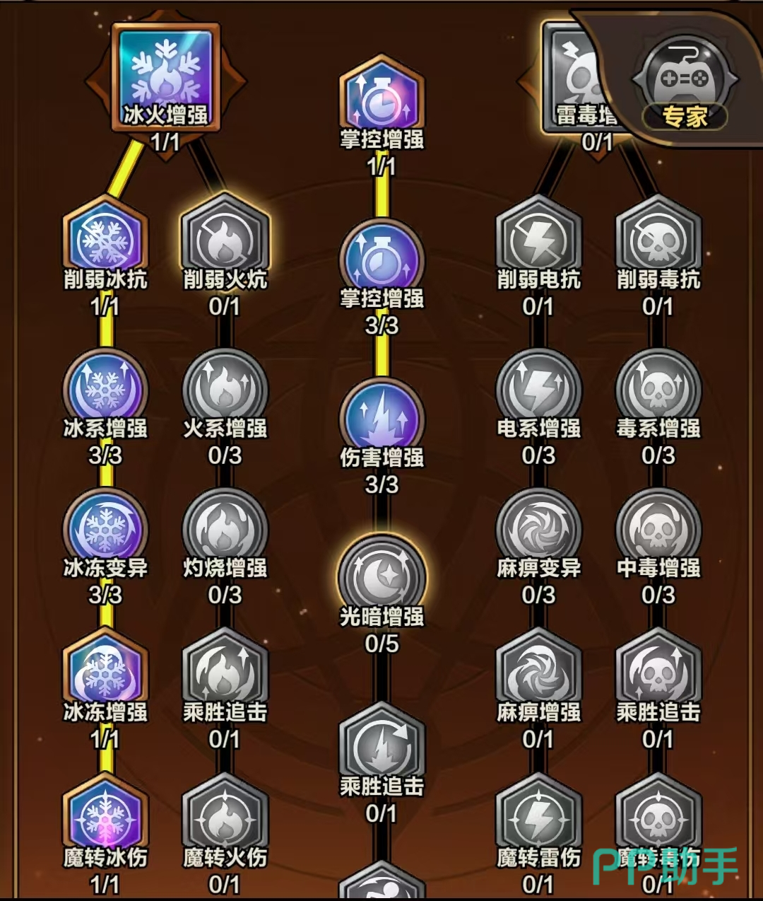 元素专精模块以伤害增益为主,需根据当前主用技能的元素类型做针对性分配。光系、暗系及魔法弹系使用者,仅需点满中间纵向一列即可获得最优性价比;剩余天赋点可根据副本环境、敌人抗性分布或个人操作习惯灵活补充其他分支。