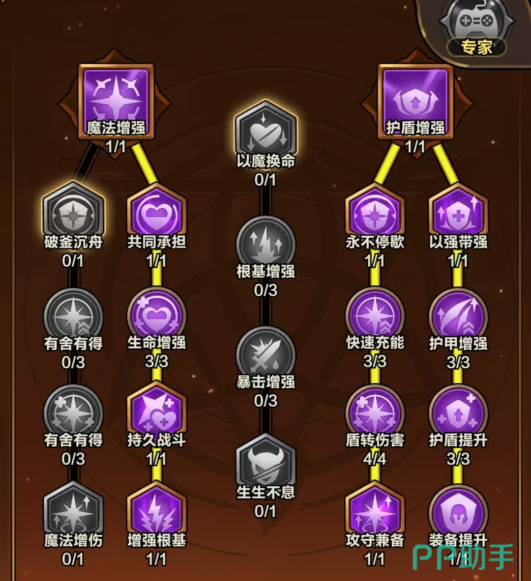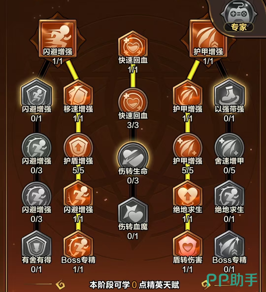需重点激活【护甲增强】分支下的【盾转伤害】,以及【闪避增强】分支中的【Boss专精】,两者配合护盾机制可显著放大对精英与首领目标的压制力;中间一栏的【快速回血】为必选天赋,用于中和【魔法天赋】中【共同承担】可能引发的生命恢复延迟等负面效果。