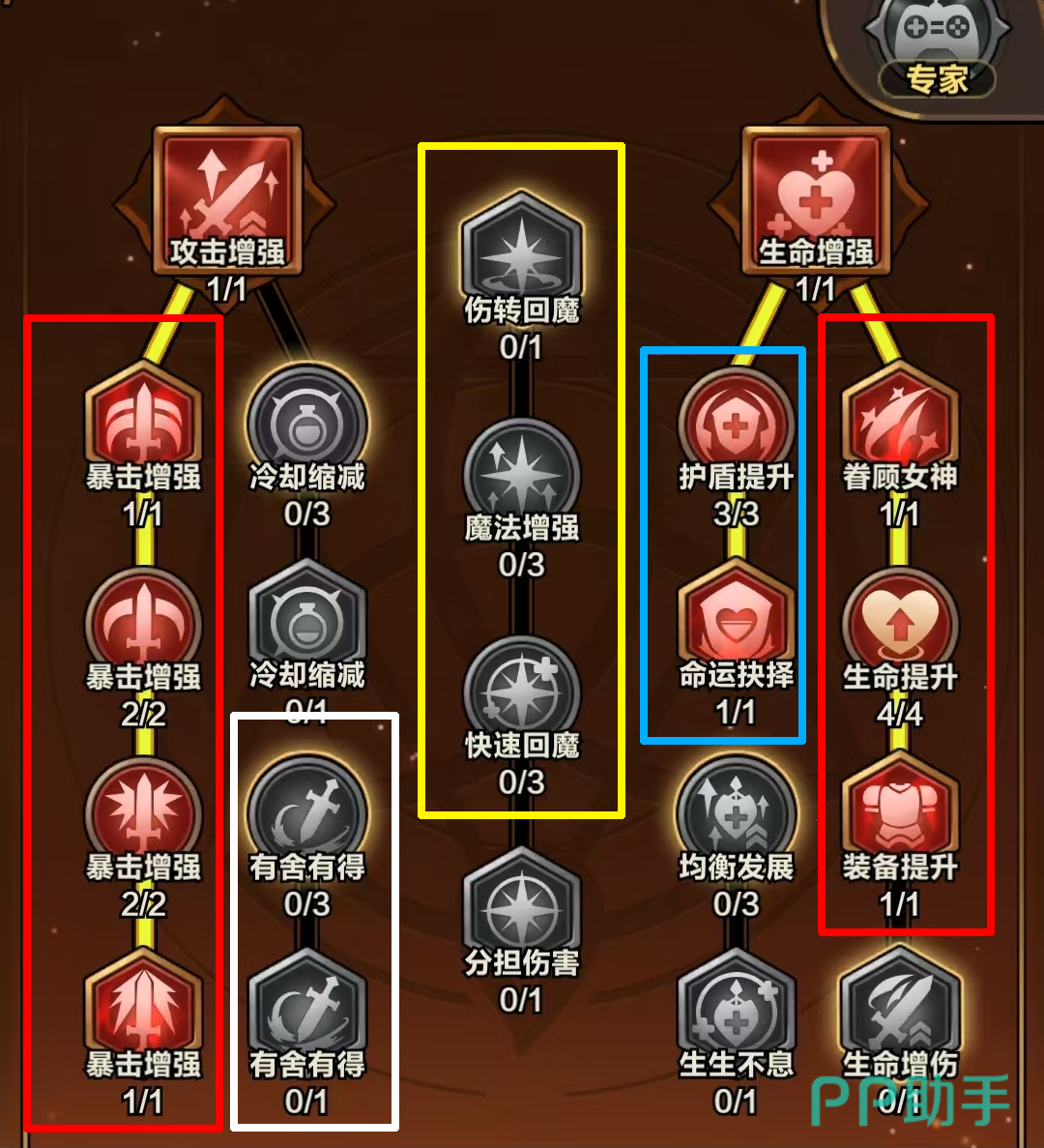 红色区域天赋为护盾流刚性需求项:左列强化输出能力,右列巩固生存根基;蓝色区域直接提升护盾总量,属本流派核心增益,必须全部激活;后期若存在魔法值循环紧张问题,可择优启用黄色区域的【伤转回魔】;若魔法续航充足,且装备/宝石已具备较多回魔词条,则推荐激活白色区域的【有舍有得】,否则无需投入。