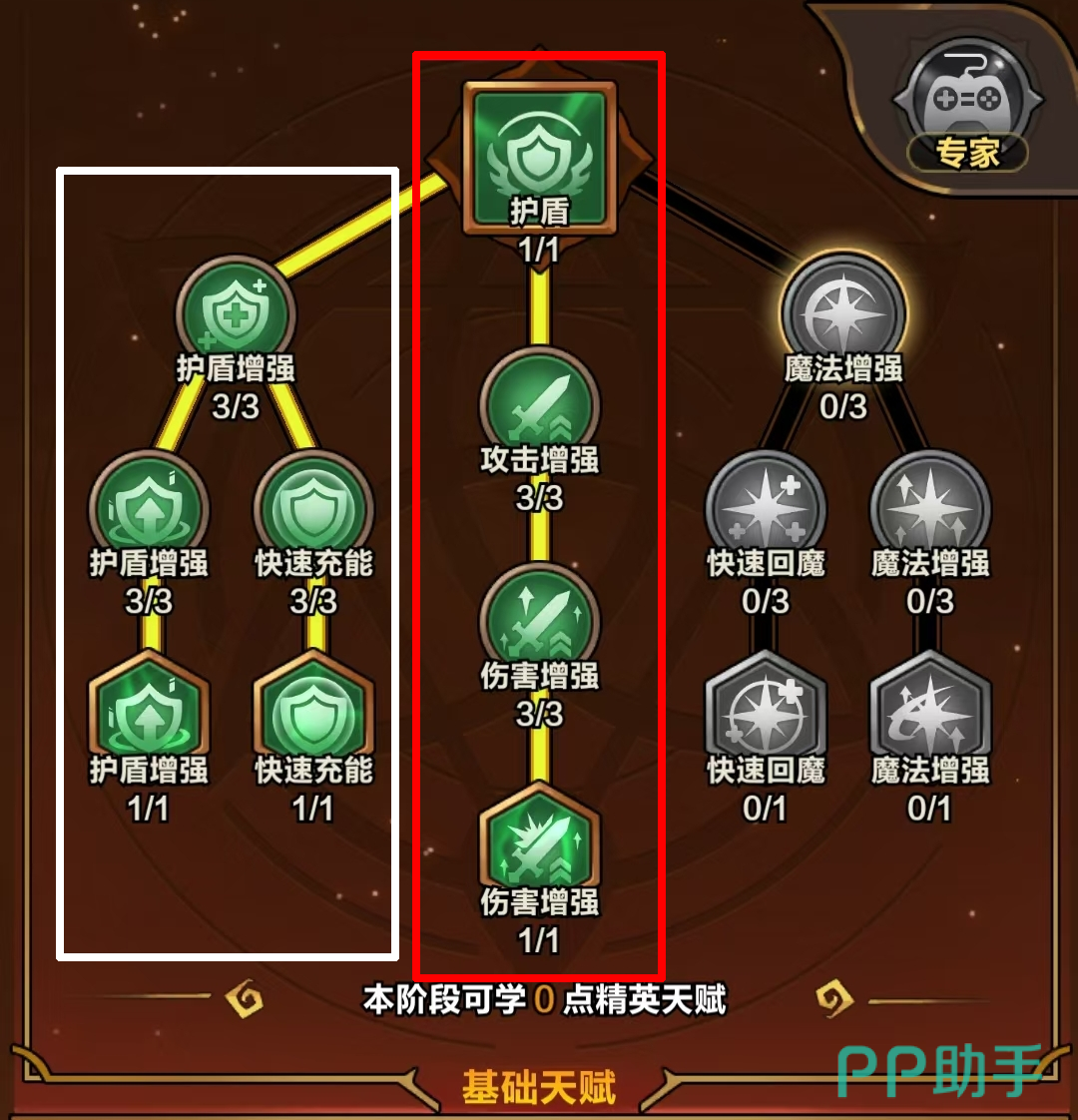 本阶段务必完成四大核心天赋:【增强根基】(提升暴击率)、【盾转伤害】(实现护盾转化输出的核心机制)、【攻守兼备】(进一步补充暴击率)、【装备提升】(强化装备属性收益)。完成上述后,返回基础天赋界面补满此前预留的白色区域天赋,即完成护盾流基础框架搭建,后续优化可围绕护盾覆盖率、转化效率及持续作战能力展开。