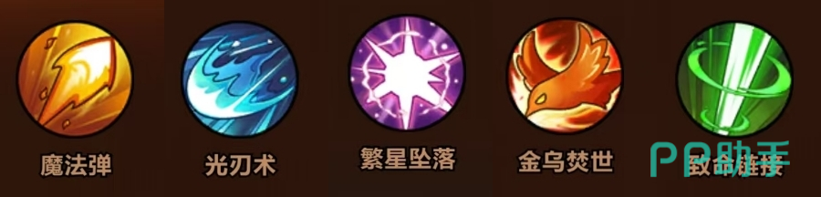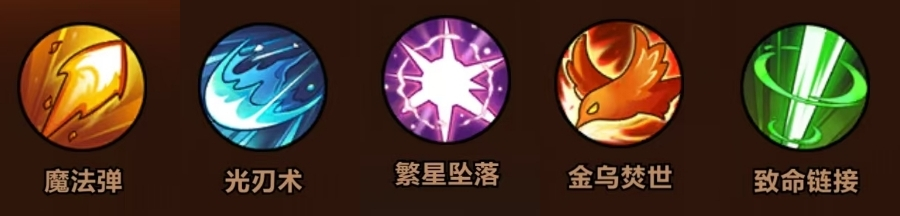 技能配置:魔法弹+光刃术+繁星坠落+金乌焚世+致命链接