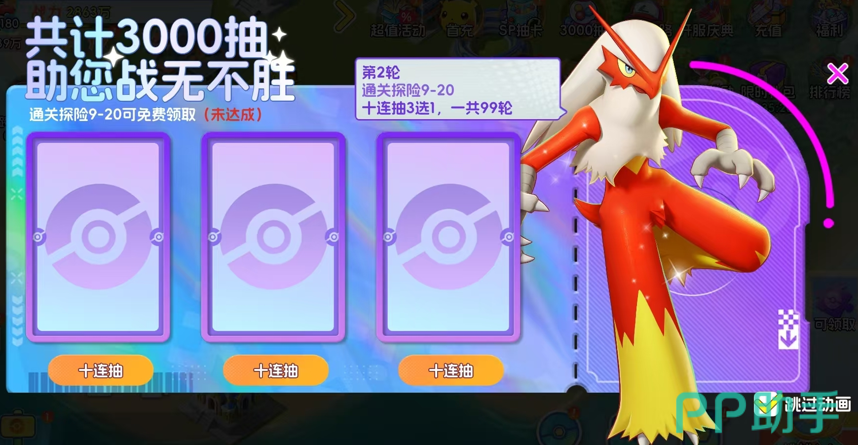 通关4-20后激活首轮抽取,每轮含3次十连抽,可从中择一领取。第二轮于通关9-20后开启。首轮建议优先获取【皮宝宝】或【小福蛋】等辅助型宝可梦,因其获取途径相对单一;后续抽取可根据主力阵容缺口灵活调整目标。