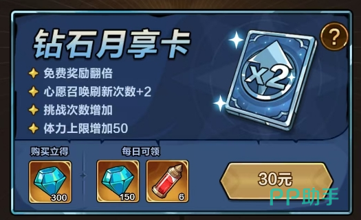 核心优势在于资源获取效率提升:免费奖励翻倍、挑战次数上限增加、体力上限提升50点;购卡即赠300钻,每日还可领取150钻及6个【宝石洗炼道具】。
