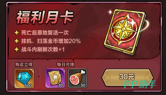 侧重战斗容错与日常收益:死亡后原地复活一次、挂机扫荡金币加成20%、战斗内刷新次数+1;购卡即得600钻,每日固定领取30张【召唤券】与30点【体力】。